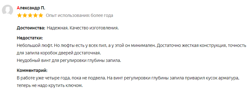 По мнению владельцев, мощная торсионная пила, многофункциональная, надежная, с хорошей сборкой. Без люфтов. Нет плавного пуска, что не очень хорошо при такой мощности.