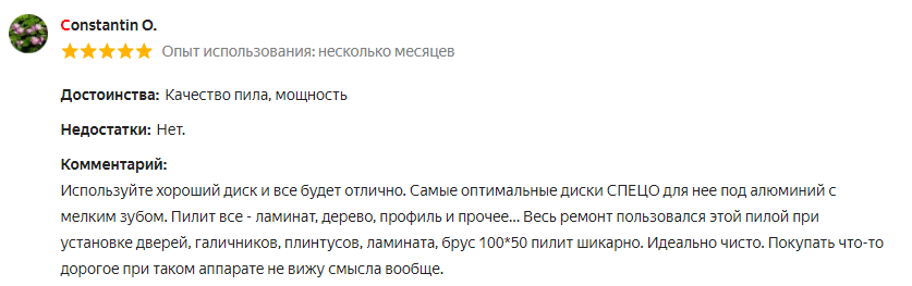 Покупатели отмечают низкую цену, мощность, наличие лазерного маркера, компактность, малую массу, надежность, долговечность. Нарекания на отсутствие плавного пуска и забивающийся пылью глазок лазера.