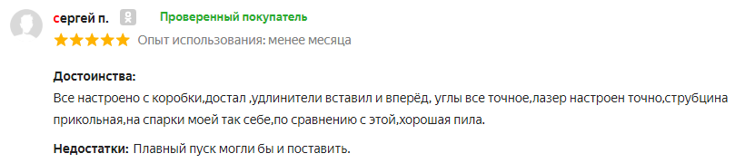 Пользователи хвалят за качественную сборку, чистый, без задиров спил, подсветку. Лазер расположен удобно – не забивается пылью. Недостаток один, но он не существенный – нет плавного пуска.