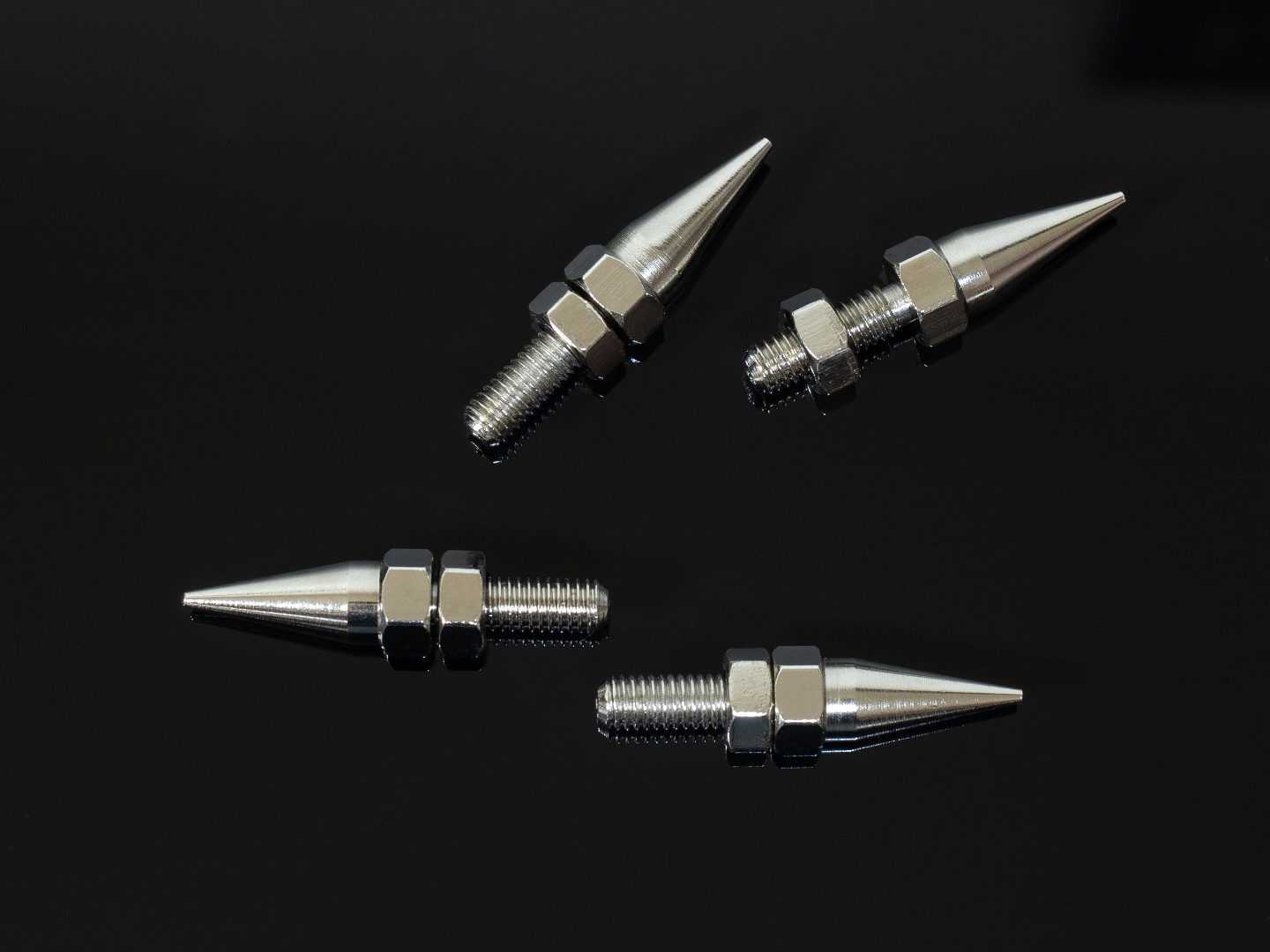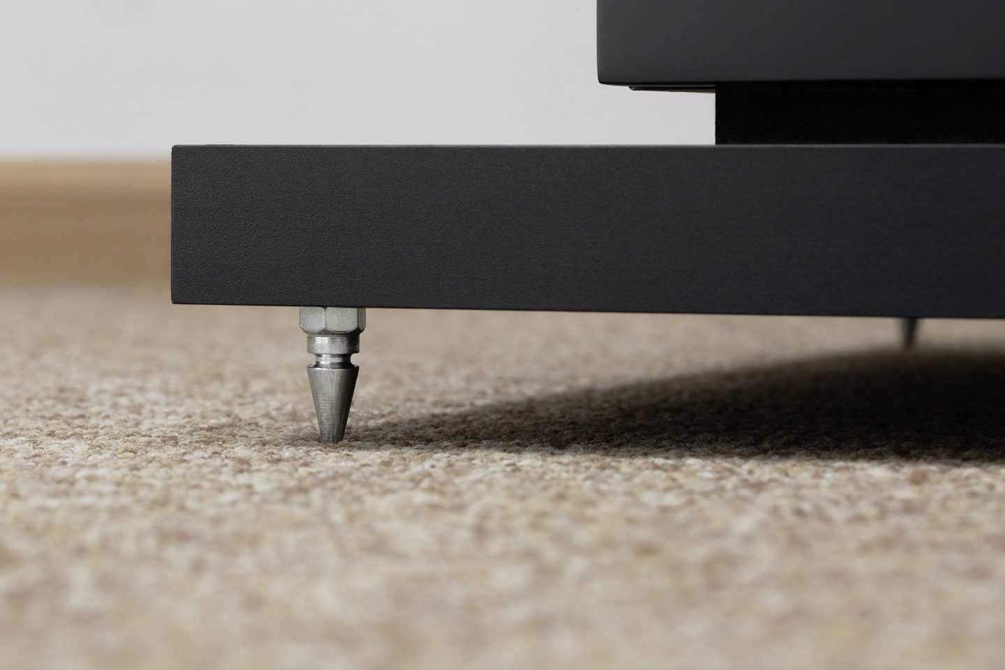 Корпуса устанавливаются на винтовых опорах, которые закреплены непосредственно на нижней плоскости, в комплекте имеется два варианта опор: шипы и демпфирующие полиуретановые полушария. Владелец может выбирать их в зависимости от типа покрытия, кстати, смешанное применение опор, возможно, также даст интересный результат. Регулировка высоты каждой опоры предусмотрена в обоих случаях, причем резьбовые стойки фиксируются контргайками.