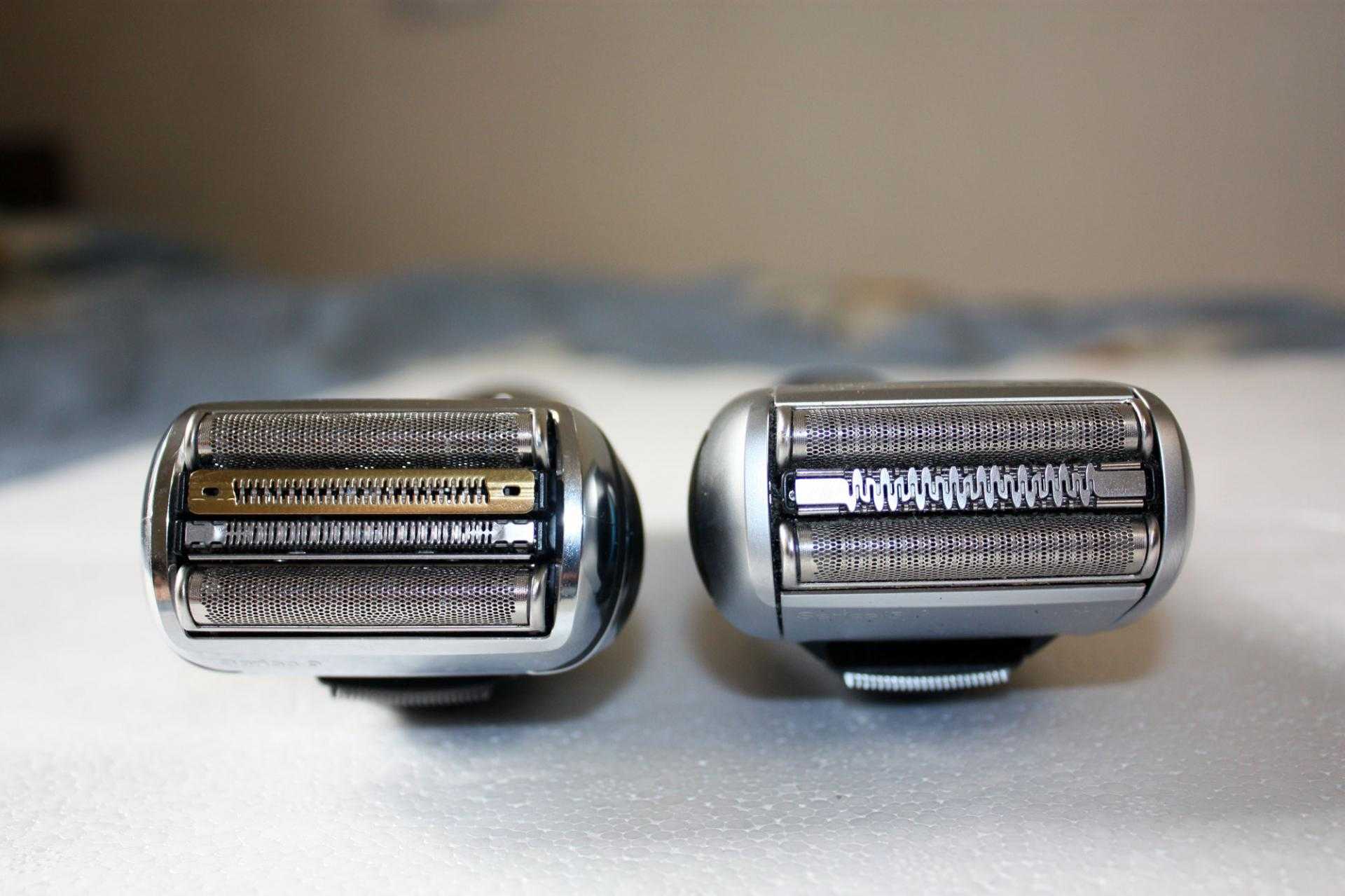 Сама же бритвенная головка в этот раз состоит из 5 элементов: 2 сетки OptiFoil по краям (отвечают за максимальную чистоту бритья), между ними триммер HyperLift&Cut (приподнимает волоски, которые прилегают к коже), затем триммер Direct&Cut (приподнимает волоски, растущие в разных направлениях), элемент SkinGuard для смягчения процесса бритья и защиты кожи. Вот так эти 5 элементов выглядят в сравнении с Series 5.