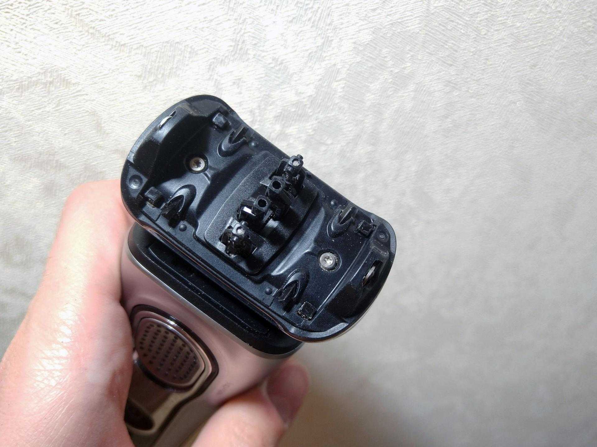 Сверху – бритвенная головка со съемными сетчатыми лезвиями. Чтобы отделить их, необходимо зажать две кнопки по бокам, затем можно вытряхнуть скопившуюся пыль.
