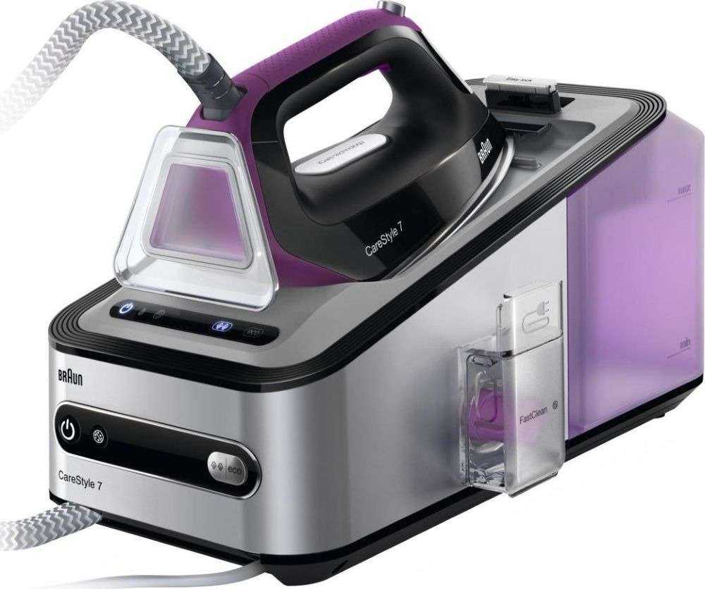 Еще одно почетное место в ТОП-10 занимает парогенератор Braun IS 7156 BK CareStyle 7 с использованием технологии Ultimate FastClean. Прибор автоматически распознает параметры ткани и регулирует подачу пара, задавая оптимальную температуру. Имеется возможность сухой глажки. Парогенератор автоматически отключается через 10 мин в вертикальном положении. Данная модель высоко оценена хозяйками, вынужденными гладить большое количество различных тканей, когда особо заметно, что высокая цена вполне соответствует производительности и качеству работы.