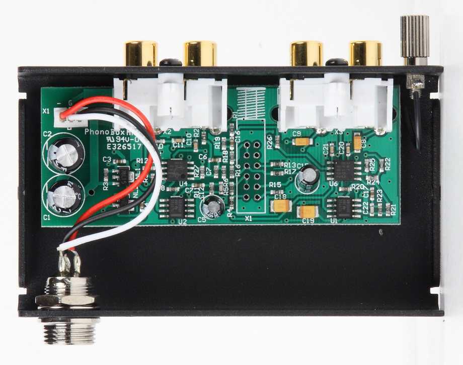 У фонокорректора небольшой, аккуратный и увесистый для своих размеров корпус. Сетевой адаптер, как и у всех остальных аппаратов в этой части теста, выносной, в виде вилке адаптера. Никаких настроек нет, только выключатель на передней панели, подсвечивающийся яркими голубыми светодиодами, и переключатель ММ/МС. Внутри вся схема собрана на одной плате, занимающей весь корпус. В плане схемотехники — ничего кардинально отличающегося от прочих участников теста. Недорогие детали, обычный в меру аккуратный монтаж, ожидаемые операционные усилители. Может быть, несколько больше внимания уделено питанию, но в целом все ожидаемо и предсказуемо.