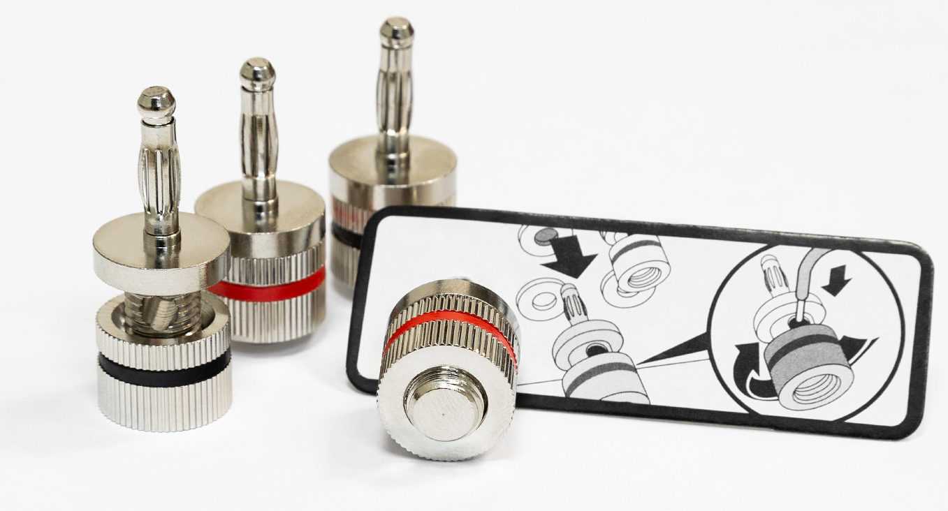 То что внешне похоже на винтовые клеммы на самом деле — кабельные наконечники, поэтому уже готовый «банановый» кабель подключается без них