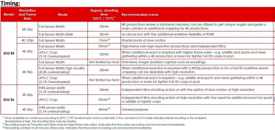 Canon опубликовала таблицу с ожидаемым временем записи (см