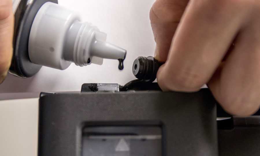 Несомненным удобством оказались емкости с чернилами, расположенные во фронтальной части принтера за прозрачными вставками. Такая «открытость» дает возможность строить свои печатно-бюджетные планы и не переживать, что в кульминационный момент чернильные модули резко опустеют. Теперь можно визуально контролировать количество чернил и вовремя пополнять емкости. Процедура заправки принтера максимально проста: нужно открыть силиконовую крышечку у емкости, аккуратно укрепить бутылочку над ней и сдавливающим движением пустить чернила внутрь.
