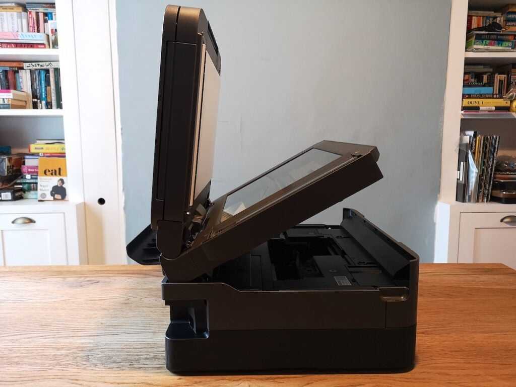 В верхней части копира / сканера находится податчик документов. За ним находится еще один бункер, который выдвигается и откидывается. Устройство подачи документов вмещает до 35 листов формата A4, а задний лоток разработан специально для размещения глянцевой фотобумаги и вмещает до 20 листов. Если вы печатаете на стандартной бумаге, она вмещает 100 листов формата A4.