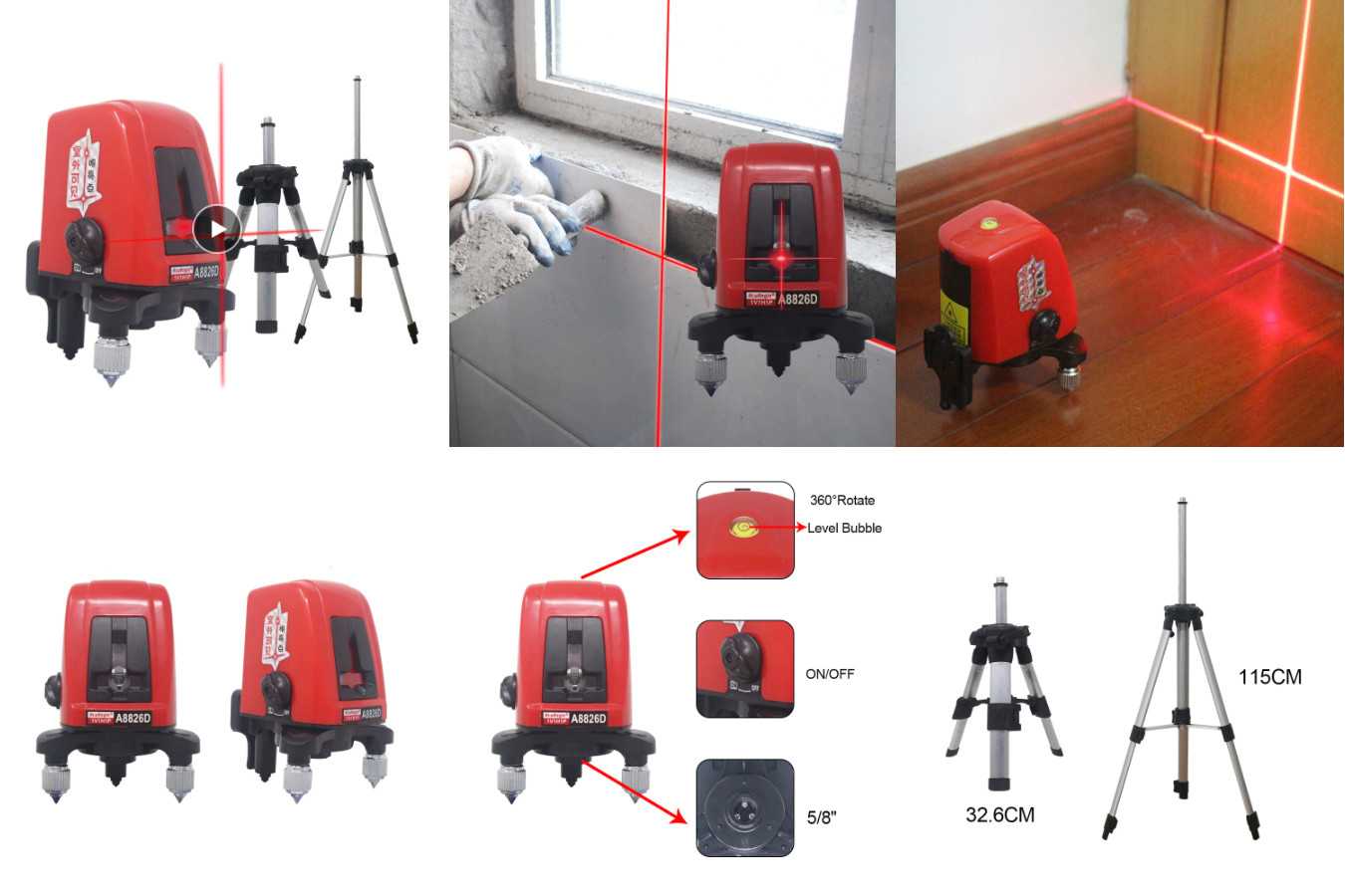 A8826D — это высокоточный лазерный уровень, который применяется во время строительных и ремонтных работ. Конструкция включает в себя подставку, которая имеет длину 115 см или 33 см.
