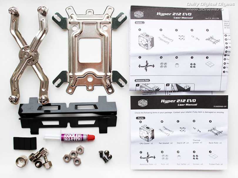В их числе прижимная X-образная пластина, универсальная backplate, две дополнительные пластиковые накладки для установки второго вентилятора, термопаста Cooler Master, винты, гайки и шайбы, а также инструкция по сборке и установке кулера.