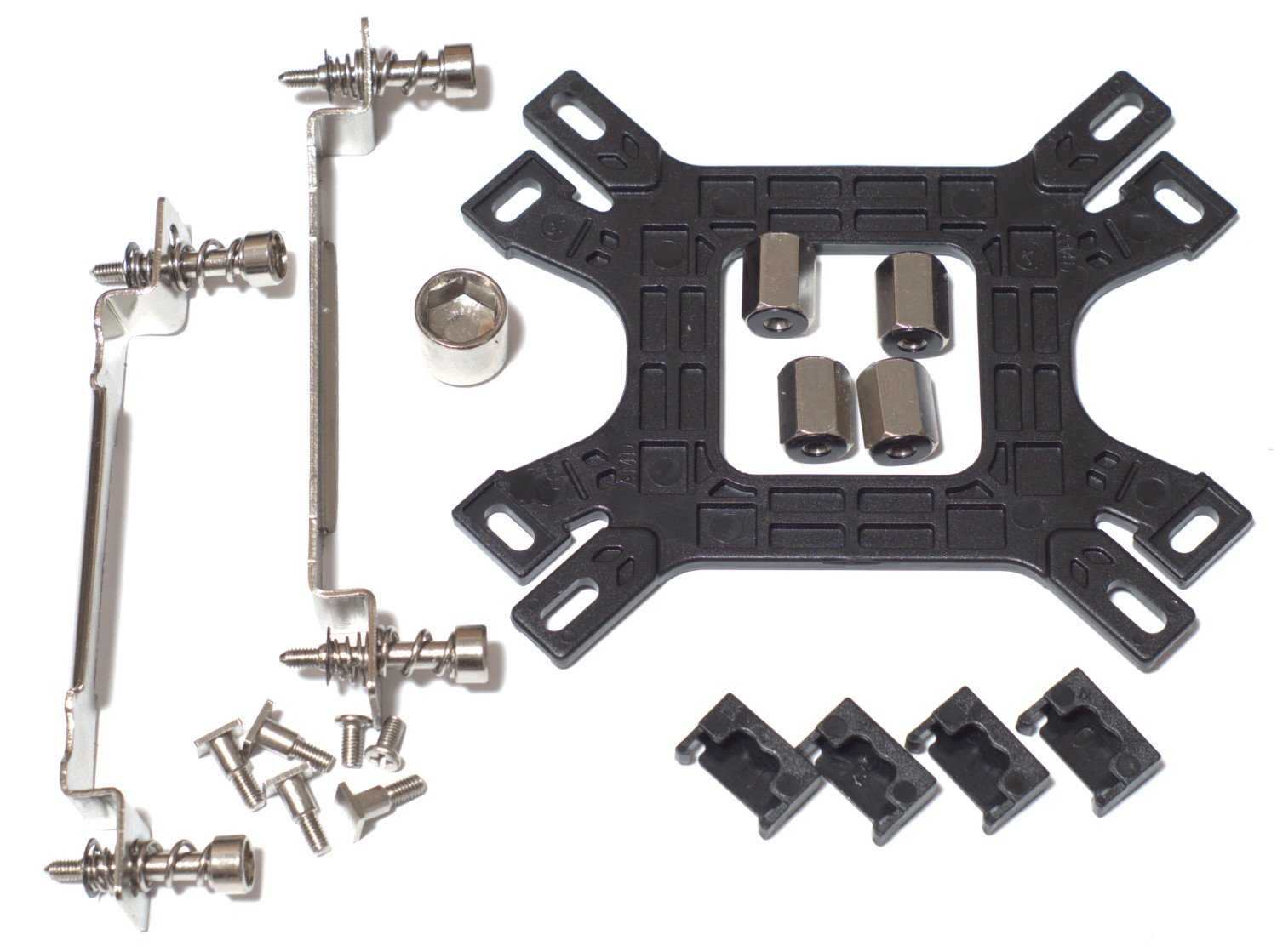 Внутри упаковки и Hyper 212 Plus и аксессуары находятся в контейнере из прозрачного пластика. В перечень аксессуаров, входящих в поставку кулера, входят: термопаста, четыре скобы для крепления двух вентиляторов, универсальный backplate, крепление для установки на поддерживаемые платформы и инструкция пользователя.