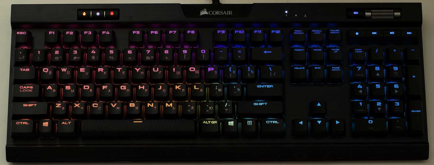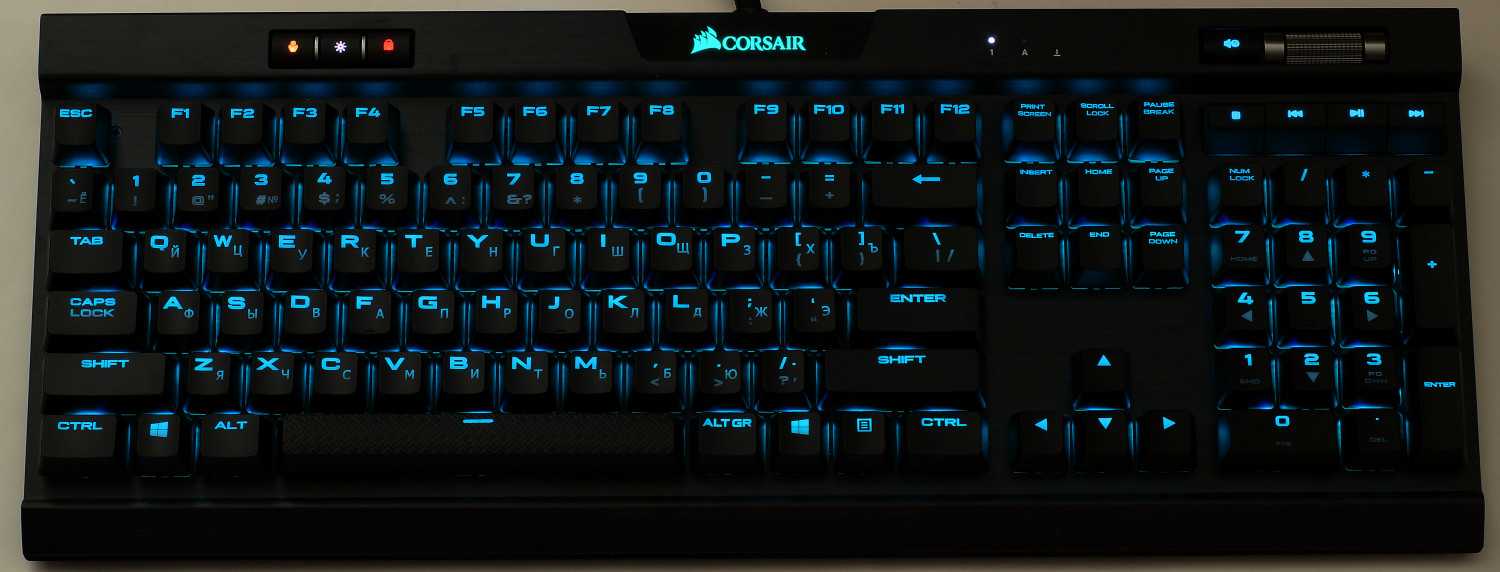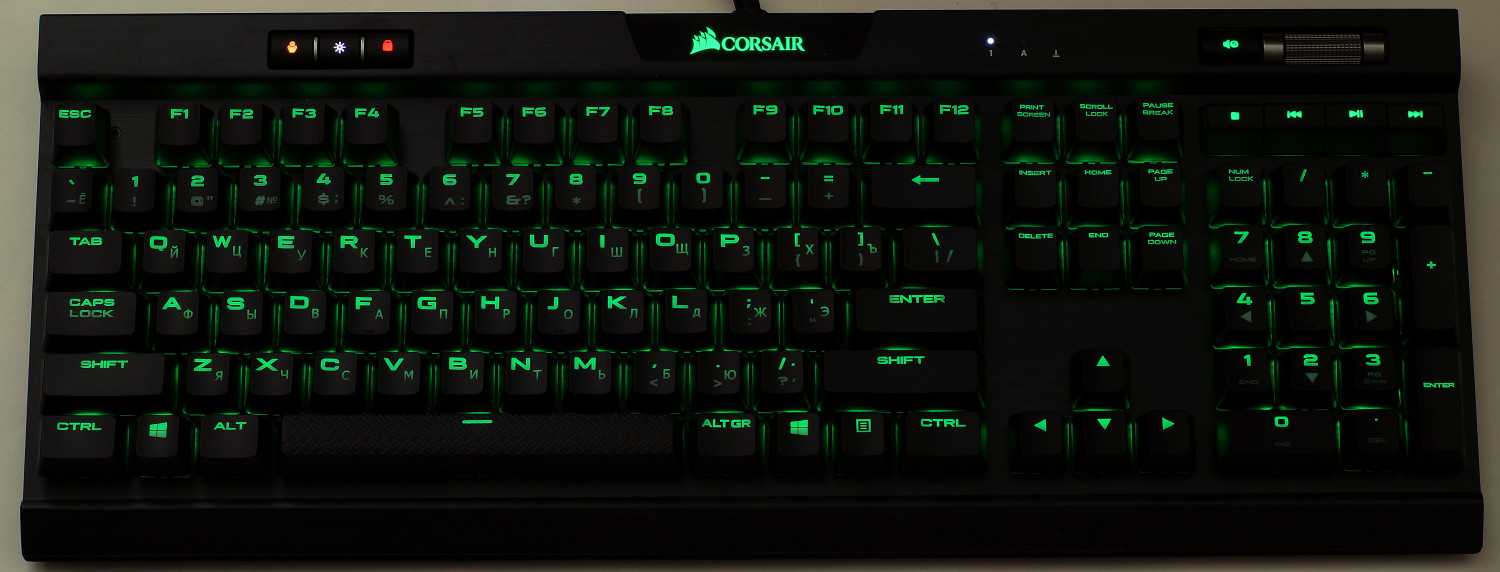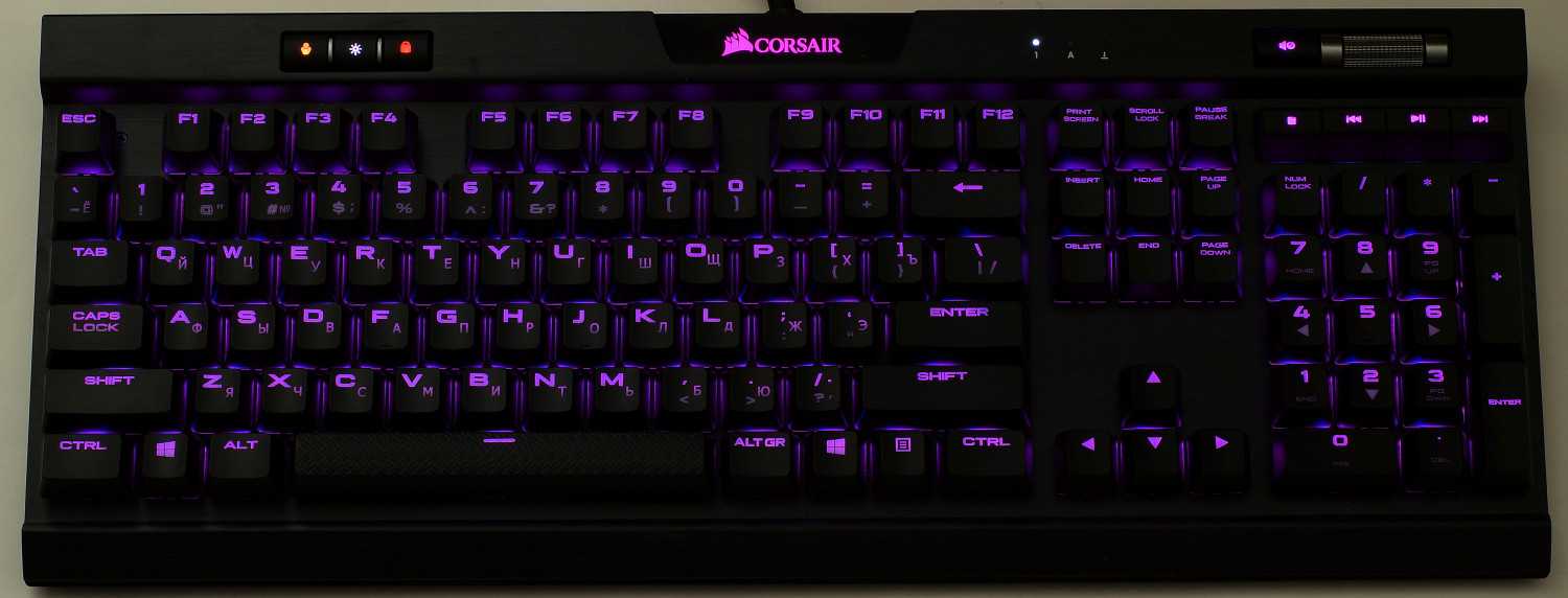 Кроме клавиш подсвечиваются и декоративные элементы. В левом верхнем углу логотип Corsair, а по бокам клавиатуры полоса по всей ширине корпуса. Выглядит очень эффектно, за подсветку однозначный плюс.