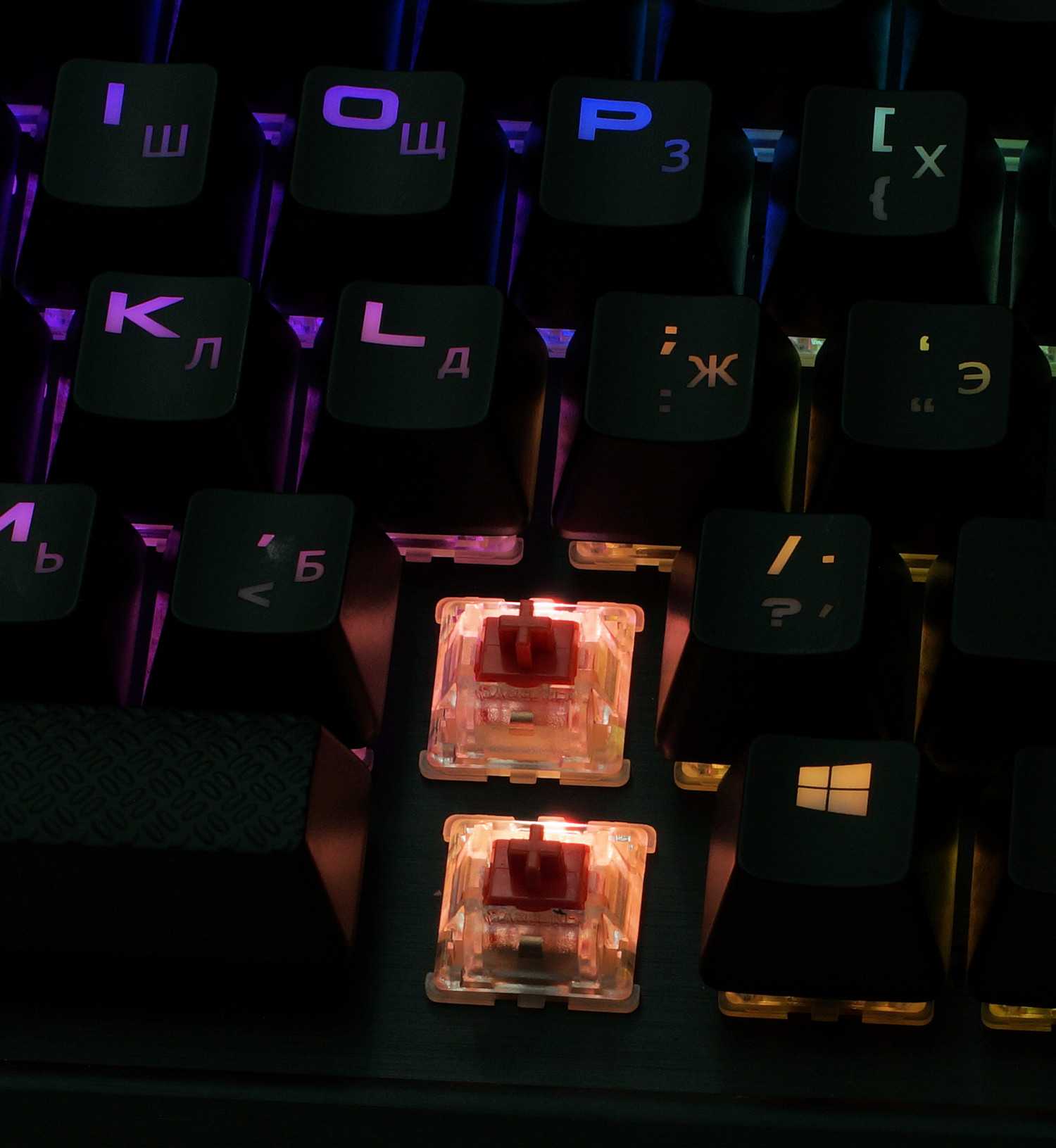Единственный, на наш взгляд, недостаток эргономики – это разные размеры латинских букв и кириллицы, а также их размещение, связанное с особенностью реализации RGB-подсветки механических переключателей Cherry MX Silent, но об этом чуть ниже.