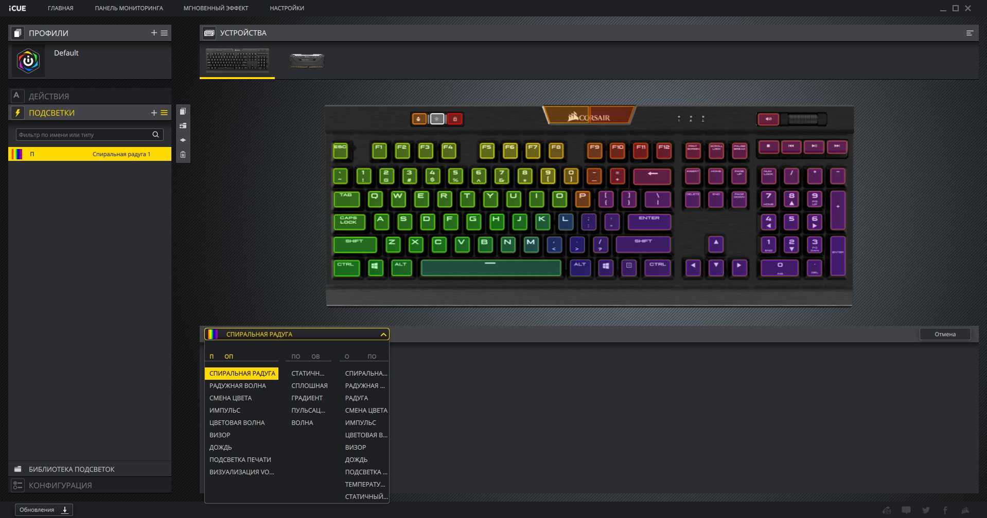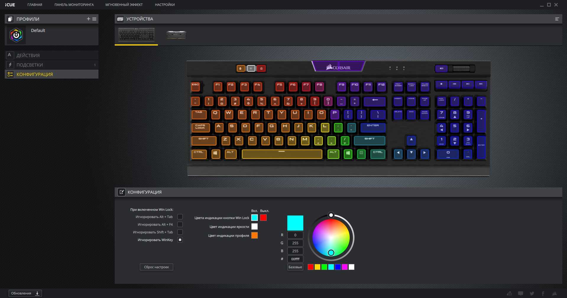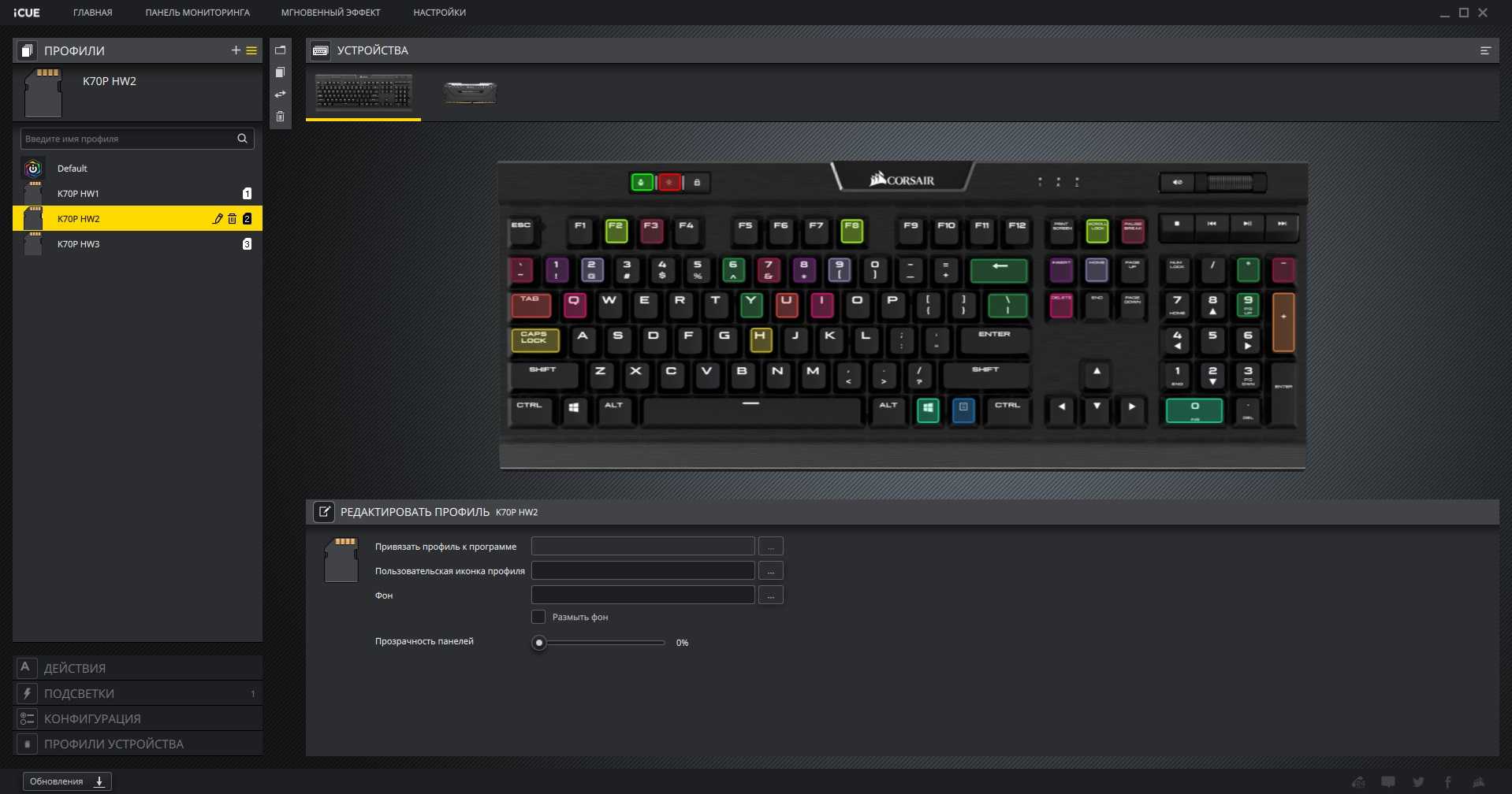 Для механической игровой клавиатуры Corsair K70 RGB MK.2 в интерфейсе можно выбрать один из трех профилей или профиль по-умолчанию. Причем активацию профиля можно привязать к конкретной программе.