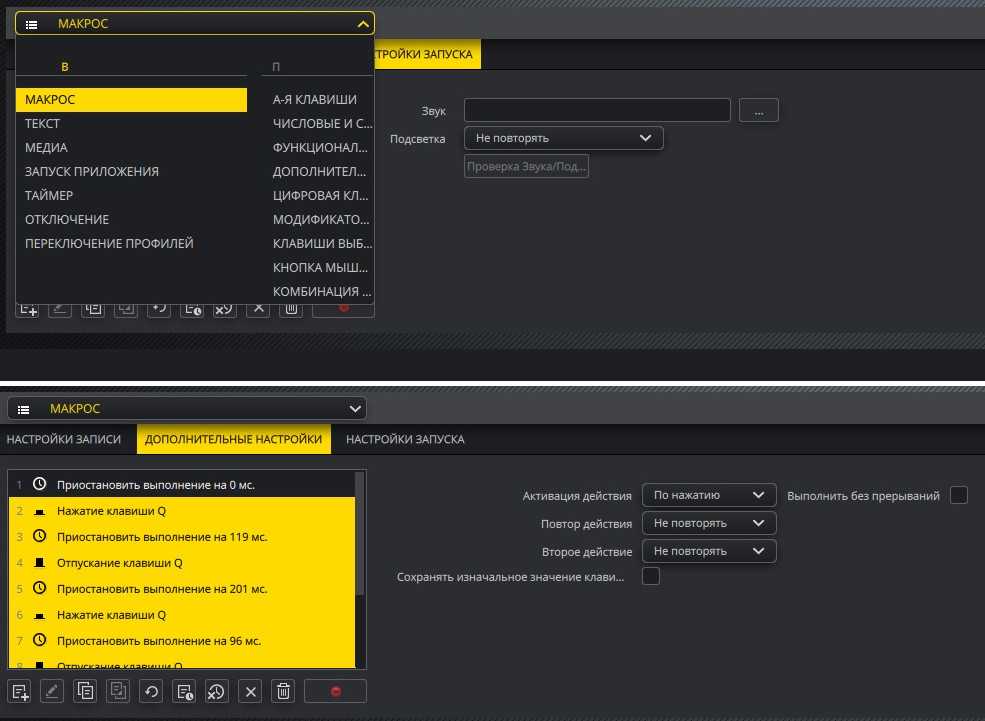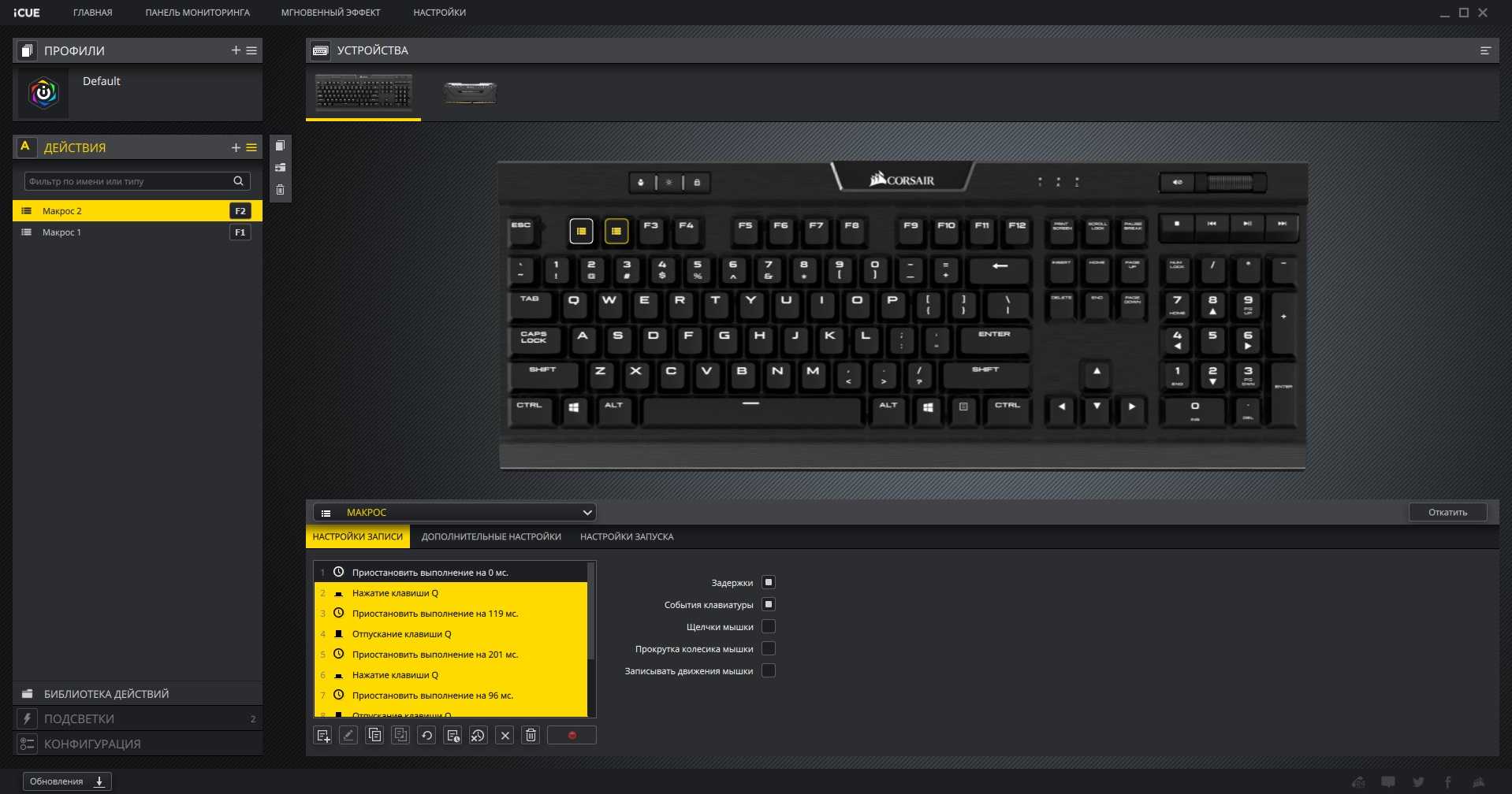 1. «Действия». Раздел, отвечающий за переназначение клавиш, запись макросов и событий, которые будут происходить при нажатии.