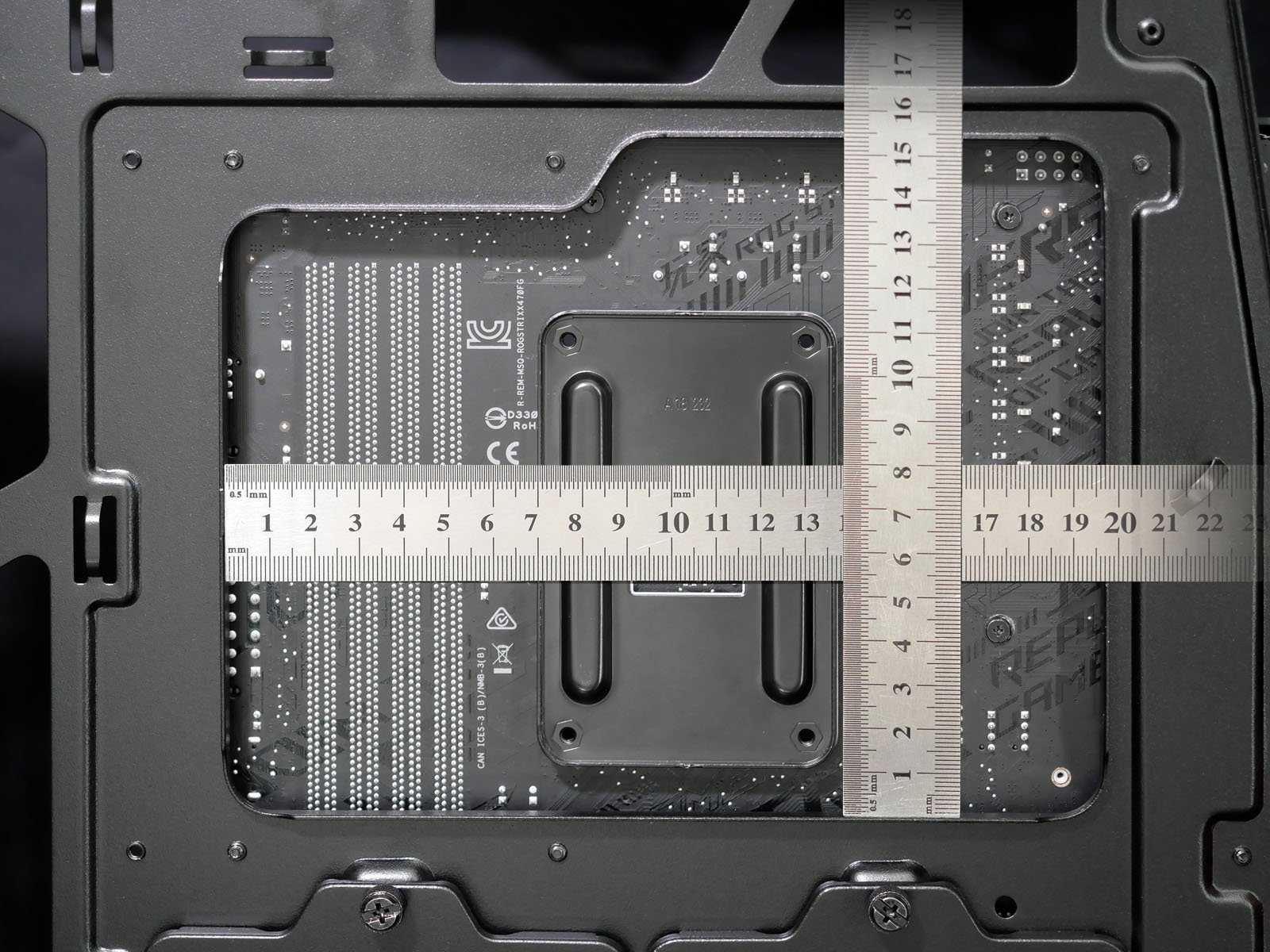 Запас по высоте для кулера даже чуть больше заявленного — около 165 мм. Вырез для доступа к обратной стороне процессорных разъёмов достаточно крупный, чтобы не перекрыть бэкплейты на полноразмерных ATX или CEB-платах.