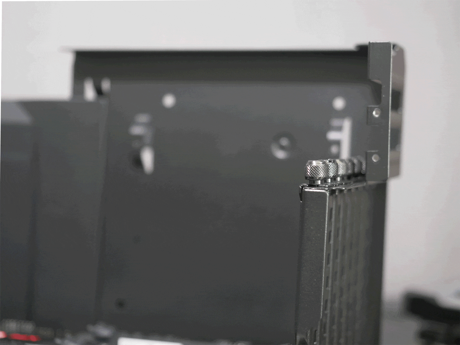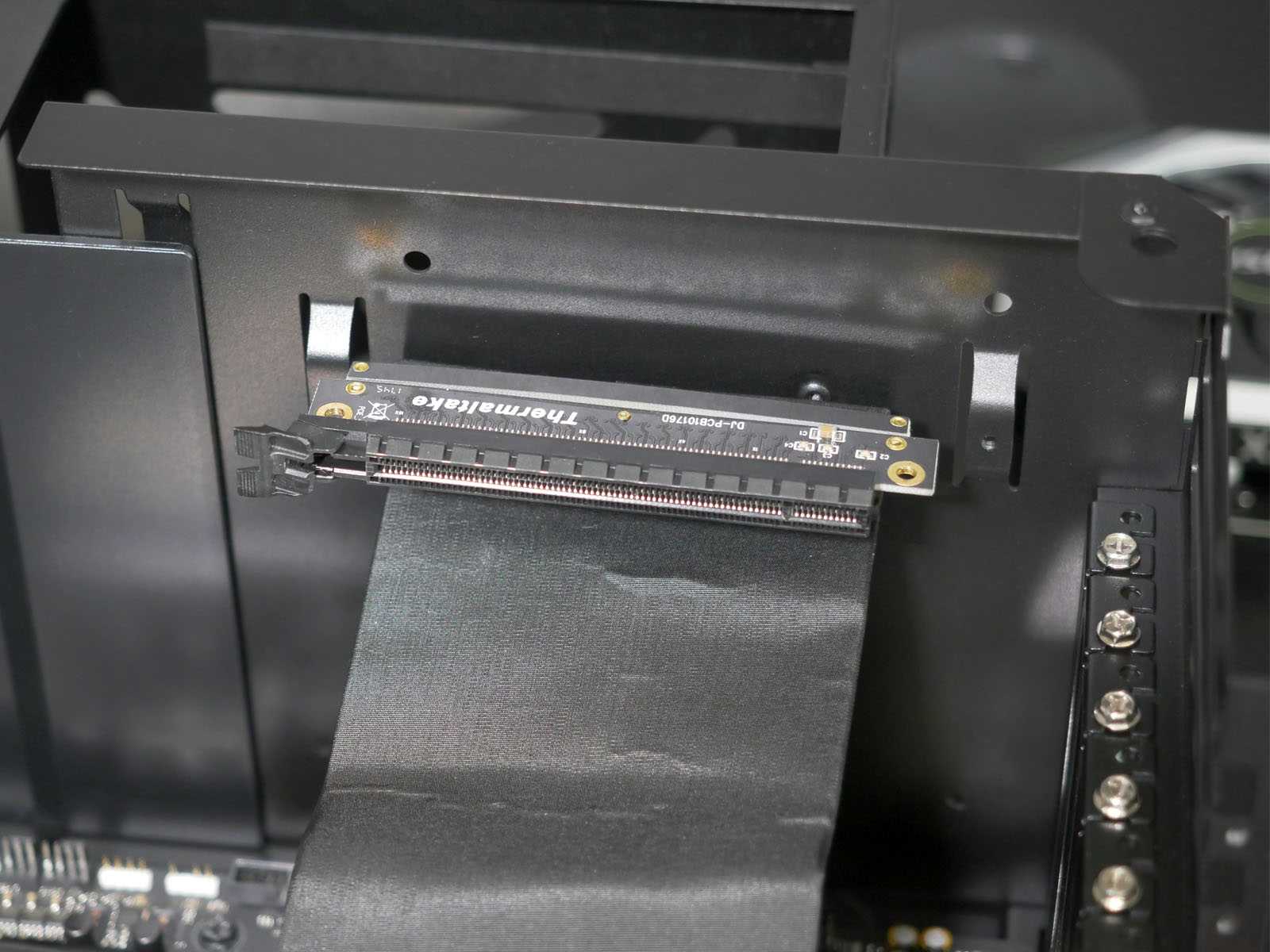 Длинные видеокарты, ввиду отсутствия корзин для накопителей, горизонтально войдут без проблем. А вот с вертикальным размещением есть особенности. Во-первых, винты с крупной накатанной головкой у горизонтальных слотов мешают. В них упирается бэкплейт от видеокарты. Потребуется замена на винты с маленькими шляпками. Во-вторых, райзер потребуется с горизонтальными креплениями и малой высотой. Например, имеющийся под рукой «вертикальный» экземпляр от одного из корпусов Thermaltake не вместился.
