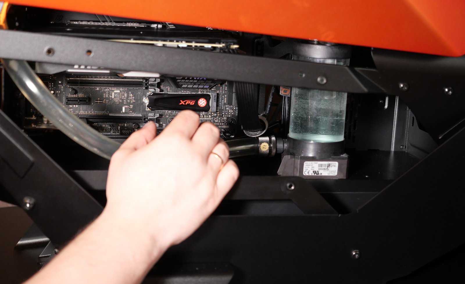 Для установки блока питания предварительно необходимо демонтировать пластиковый кожух. Он зафиксирован на одном винте с накатанной головкой под фронтальным вентилятором. Кроме того, сдвинуть кожух перед снятием не даст прикрученная к нему пластина для установки резервуаров СЖО, её также временно потребуется снять.