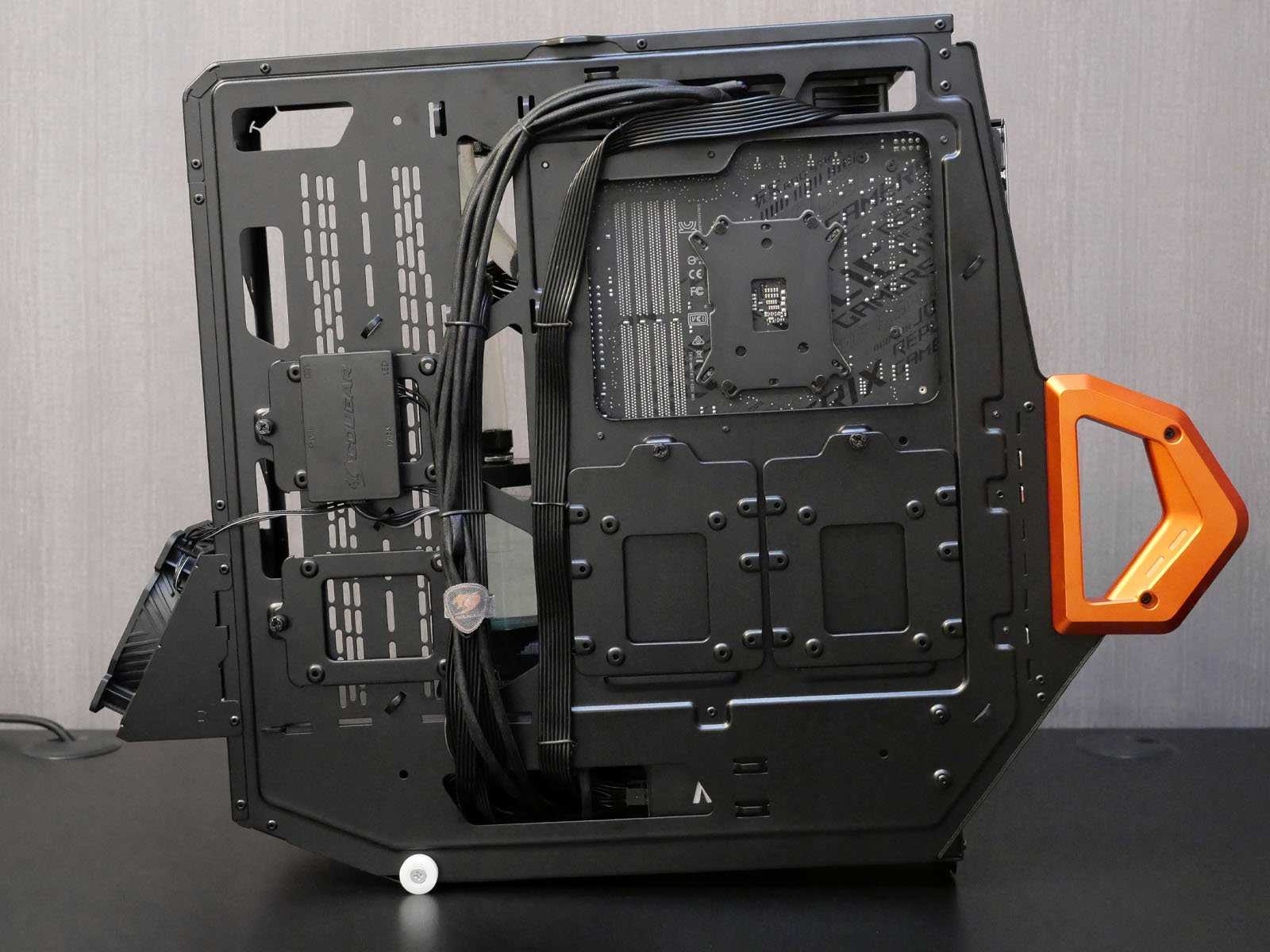 В собранном виде заднее ребро жесткости с надписью Cougar немного мешает подключению кабелей в порты на задней панели материнской платы.