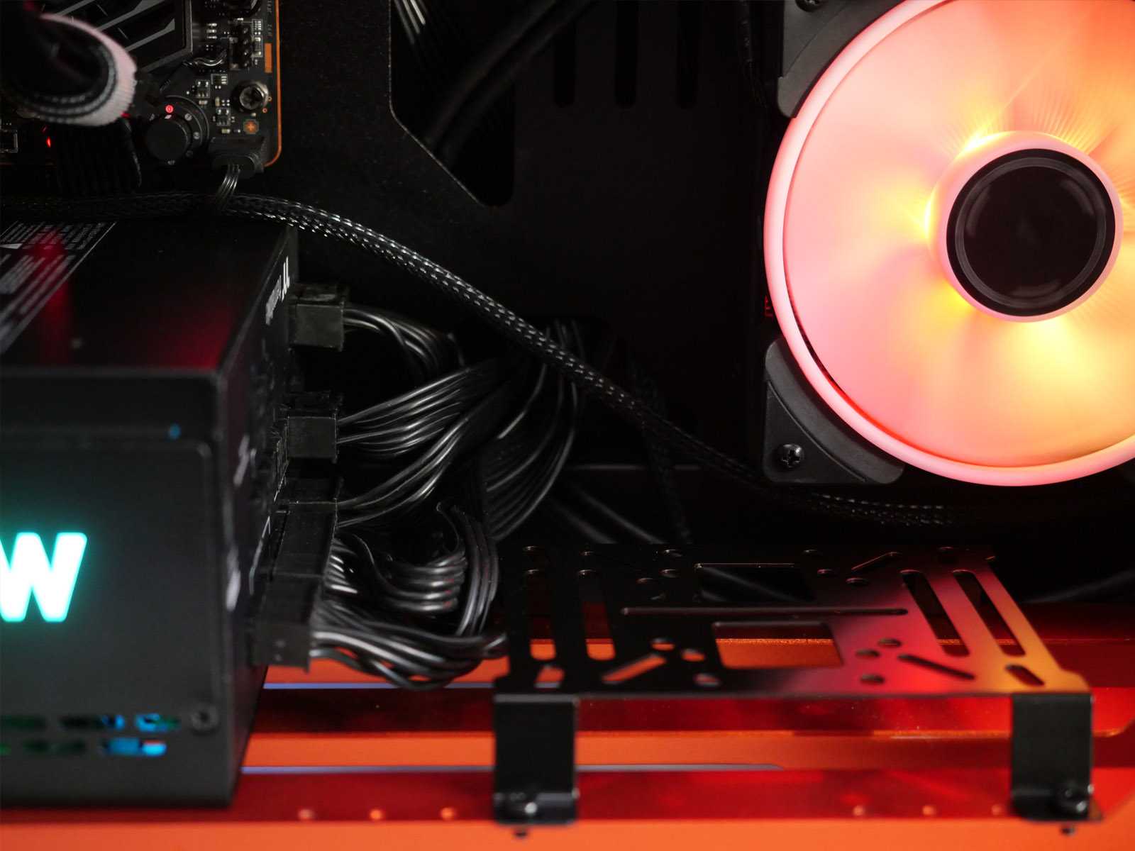 Блок питания удобнее устанавливать, открутив сначала рамку, на которой он фиксируется. В случае с модульными моделями такой подвес делает процесс снятия для профилактической чистки или обслуживания несложным процессом. А вот спрятать неаккуратные выводы проводов с фронтальной части практически некуда. Ограничением для длинных БП будут 220 мм при крайнем правом положении платформы для помп жидкостного охлаждения.