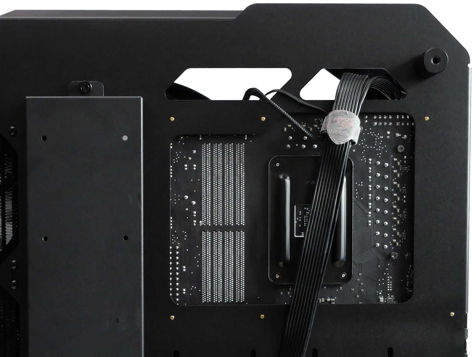 Вырезов для удобного подведения кабелей к комплектующим сделано достаточно и все имеют крупные размеры, чтобы спокойно пролезли штекеры. Задумка с вертикальным коробом для основного пучка проводов хорошая и при наличии удлинителей разъёмов питания процессора позволит сзади всё спрятать практически идеально. В нашем случае удлинителей не было под рукой, а длины в 65 см у восьмипиновых кабелей от блока питания Thermaltake Toughpower PF1 ARGB 1050W не хватило, чтобы реализовать эту задумку.