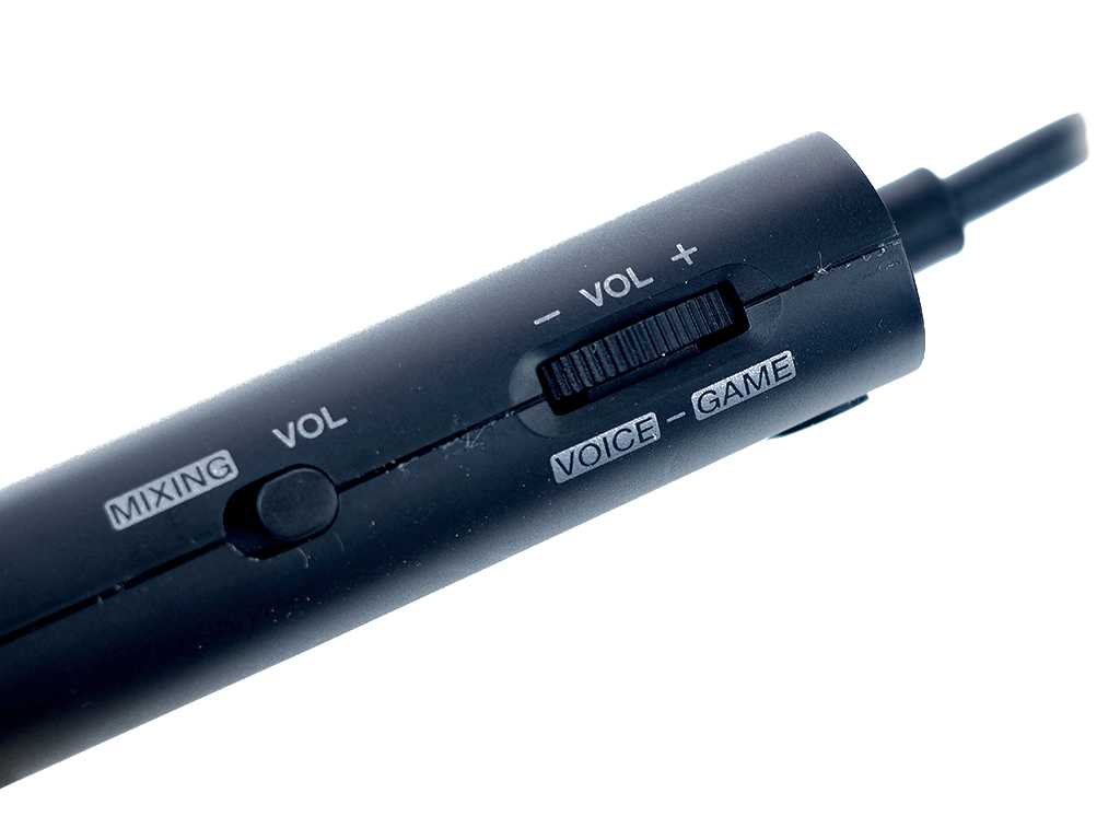 За слайдером расположилось небольшое колесо. Его отличительная черта заключается в том, что вы можете регулировать и выбирать, что будет звучать громче на выходе: звук игры (музыки) или ваши комментарии через микрофон.