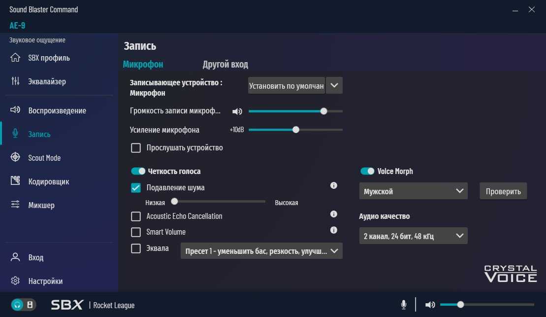 В Sound Blaster AE-7 применён качественный тракт для микрофонного входа на отдельном операционном усилителе. В совокупности с функцией Crystal Voice получается отличная запись голоса, что порадует геймеров и любителей сетевого общения. Помимо этого, в выносном пульте имеются встроенные микрофоны, что позволяет полноценно общаться с друзьями и оппонентами во время игры, даже если у вас только качественные наушники, а не полноценная гарнитура.
