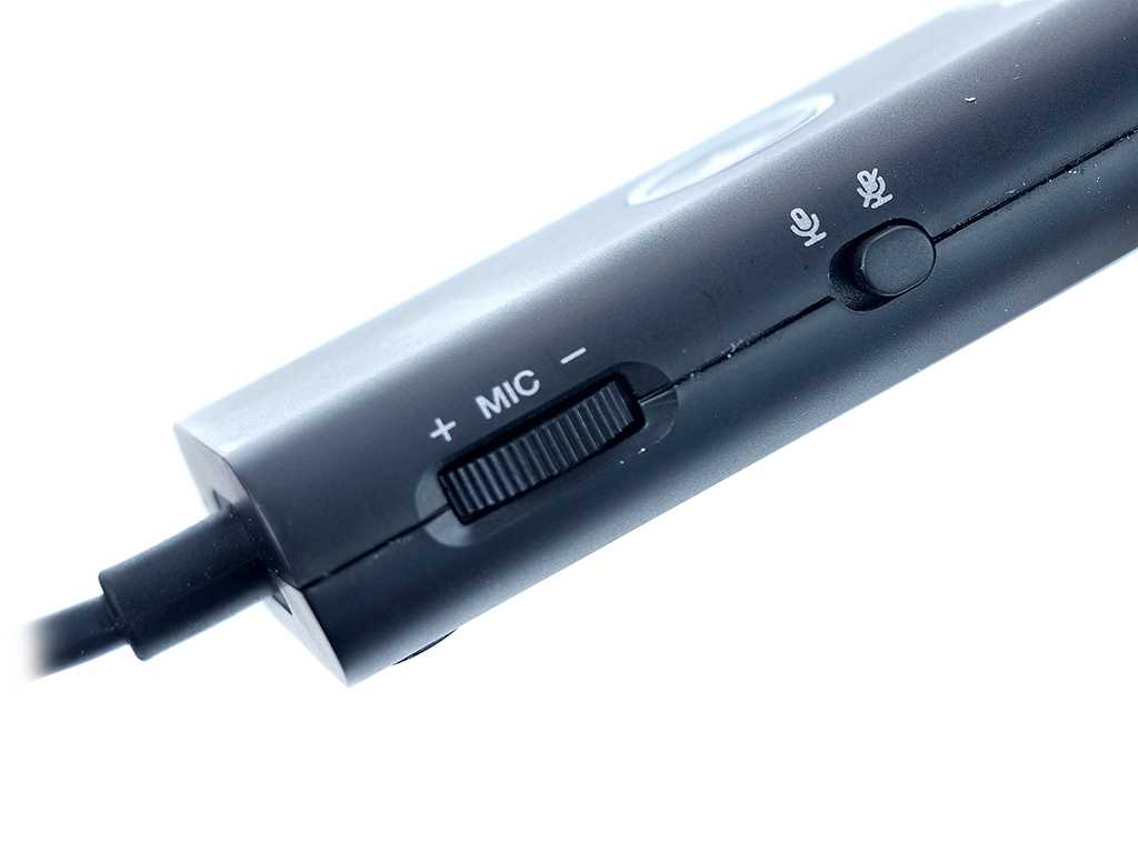 Но вернемся к главному, а точнее к системе управления звуковой картой. На левой части коробочки разместилось колесо для регулировки уровня громкости микрофона. Как вы помните, именно в левый разъем мы можем подключить внешний микрофон. Ближе к разъему поместили слайдер, отвечающий за полное отключения микрофона.