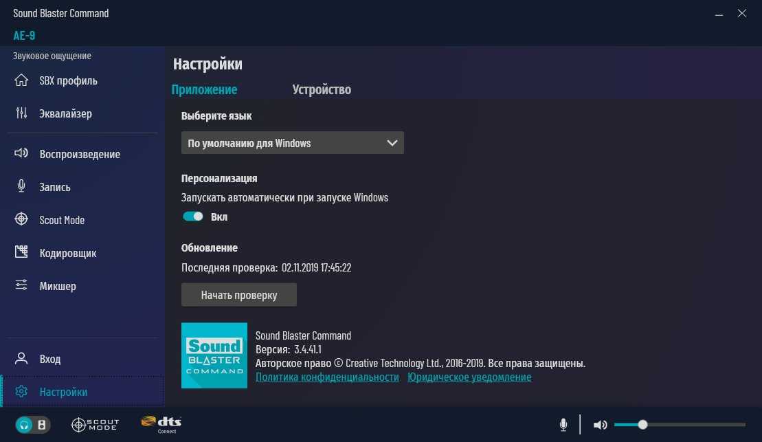 - Драйвер аудиокарты: v6.0.105.52. Sound Blaster Commander v3.4.72.1.