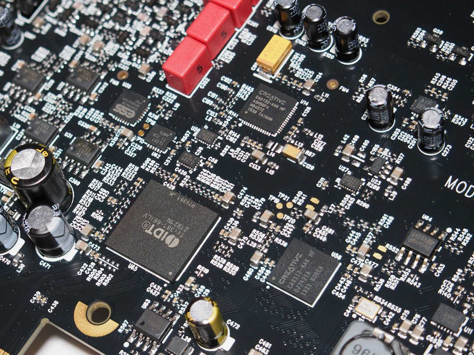 Все карты серии Sound Blaster Z оснащены новым четырехъядерным процессором для обработки звука. Этот процессор в целом полностью справляется со всеми функциями обработки сигналов, которые ему полагаются. Включение настоящего аппаратного ускорения предполагается только в случаях, когда запускаются игры. Но в последнее время для этих целей с лихвой хватает и мощности центрального процессора ПК. В Sound Blaster Z используются вполне стандартные конденсаторы, цифро-аналоговый преобразователь (DAC) и все другие чипы. Операционный усилитель главного канала — 4556A (это емкостной ОУ производства JRC). Он использовался и в других моделях звуковых карт Creative, начиная свою историю еще с линейки Sound Blaster Live!.