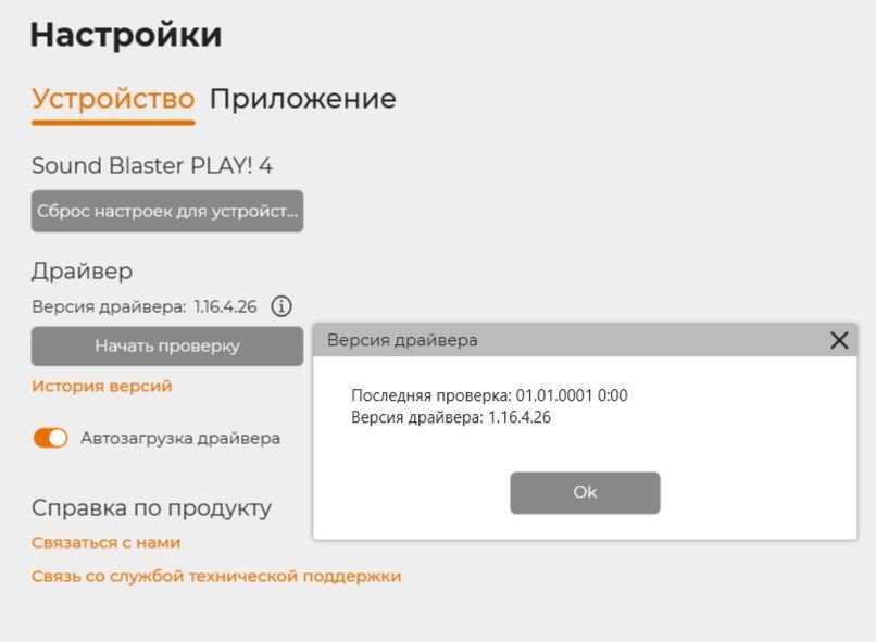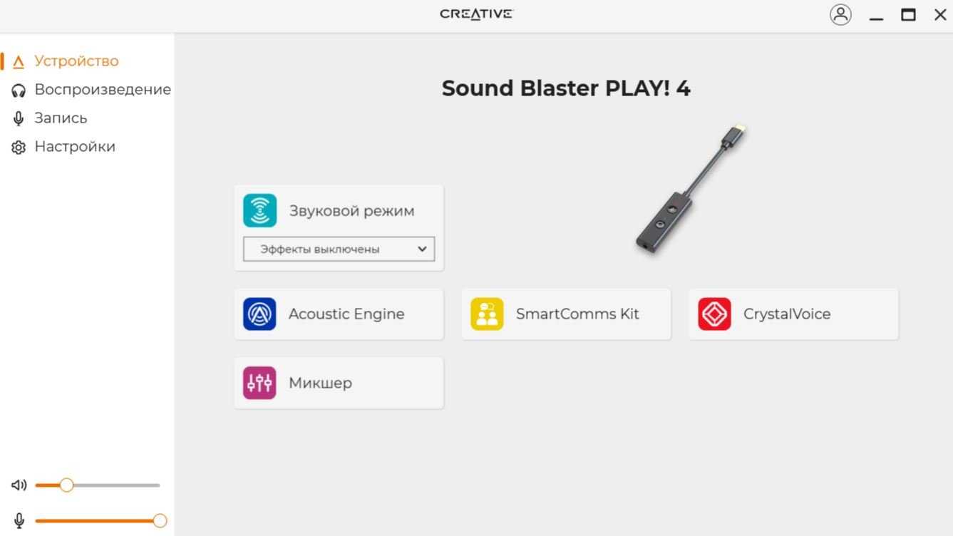 Девайс автоматически определяется как звуковое устройство. Для использования дополнительного функционала необходимо установить приложение Creative.