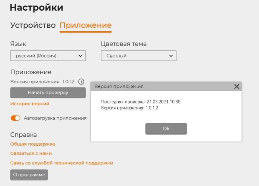 Вкладка «Настройки» проверяет, загружает и устанавливает обновление приложения и прошивку для устройства. Возможен выбор языка и цветовой схемы для приложения.