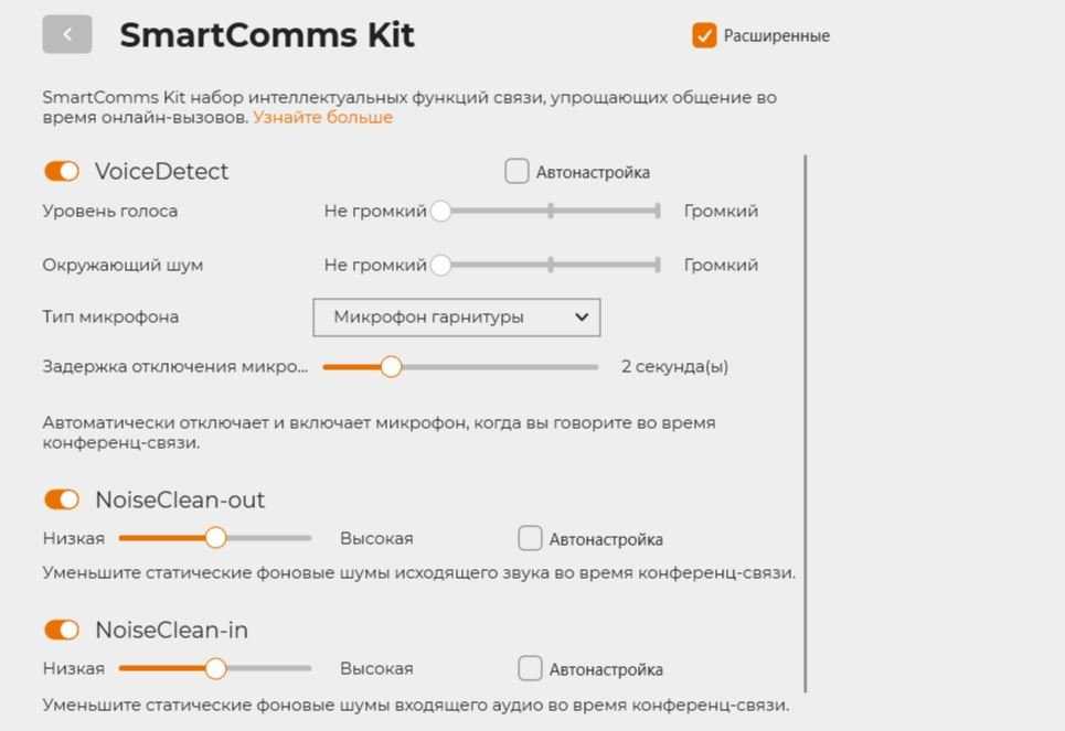 SmartComms Kit – набор интеллектуальных функций связи. Регулируется громкость голоса и окружающего шума. Отключает и включает микрофон через установленное время при отсутствии разговора. Уменьшает фоновый шум на установленный уровень (как исходящего, так и входящего звука).