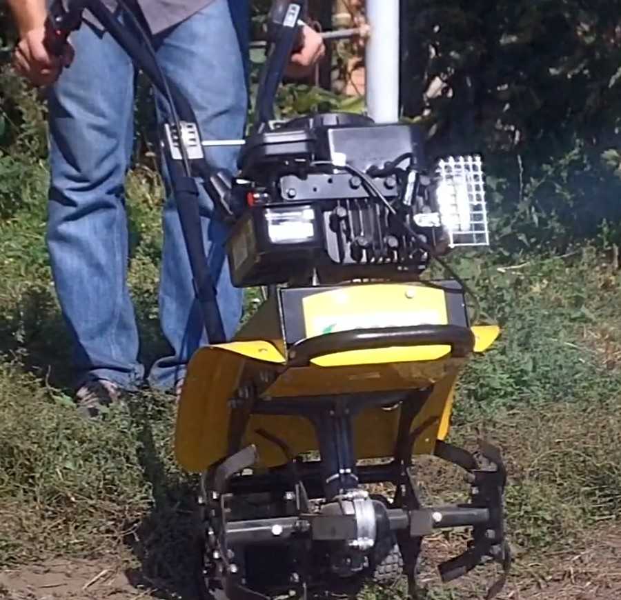 - Бензиновые устройства. Отличаются оборотистостью, мощностью, не требуют подключения к электричеству. Быстро пашут, культивируют. Встречая препятствия, выключаются, что позволяет сберечь двигатель от перегревания. Недостатками считает большие затраты на горючее, повышенная шумность.