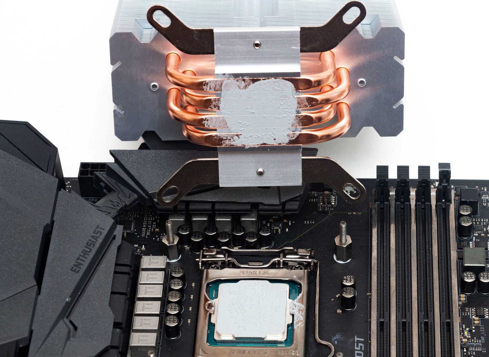 Паста с металлом в составе идеальна в качестве теплоносителя, но она является проводником электричества. Чтобы избежать ее попадания на металлические элементы материнской платы, нужно быть очень осторожным.
