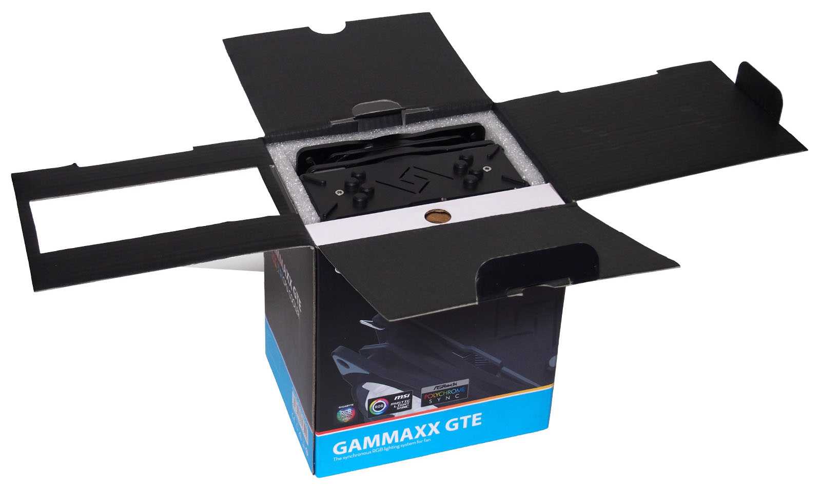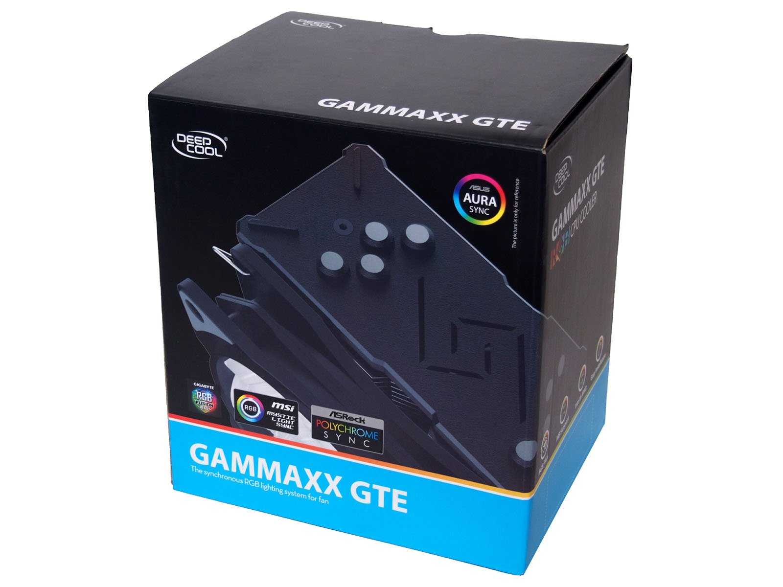Deepcool Gammaxx GTE продаётся в картонной коробке, на лицевой части которой имеется невзрачное изображение верхней декоративной крышки. Очень странно, что производитель не показал устройство «во весь рост». На обратной стороне присутствует традиционный многоязычный блок с описанием основных конкурентных преимуществ, в том числе на русском языке. Дополняет это всё спецификация на английском и схематичное изображение кулера в нескольких проекциях с указанием габаритов.