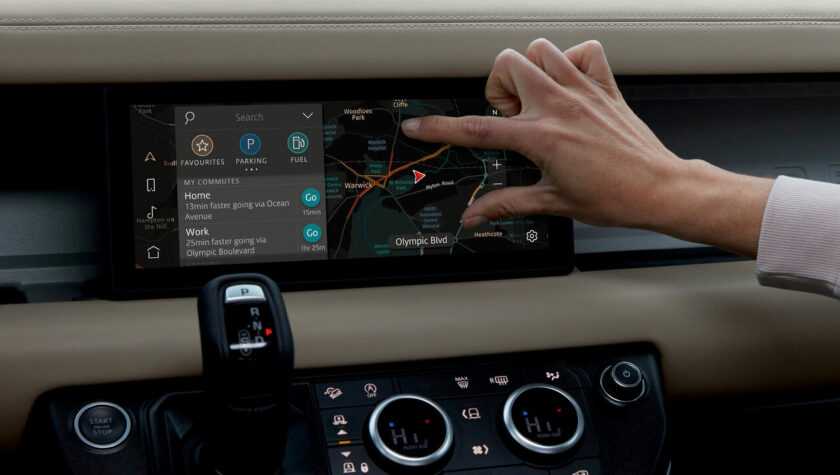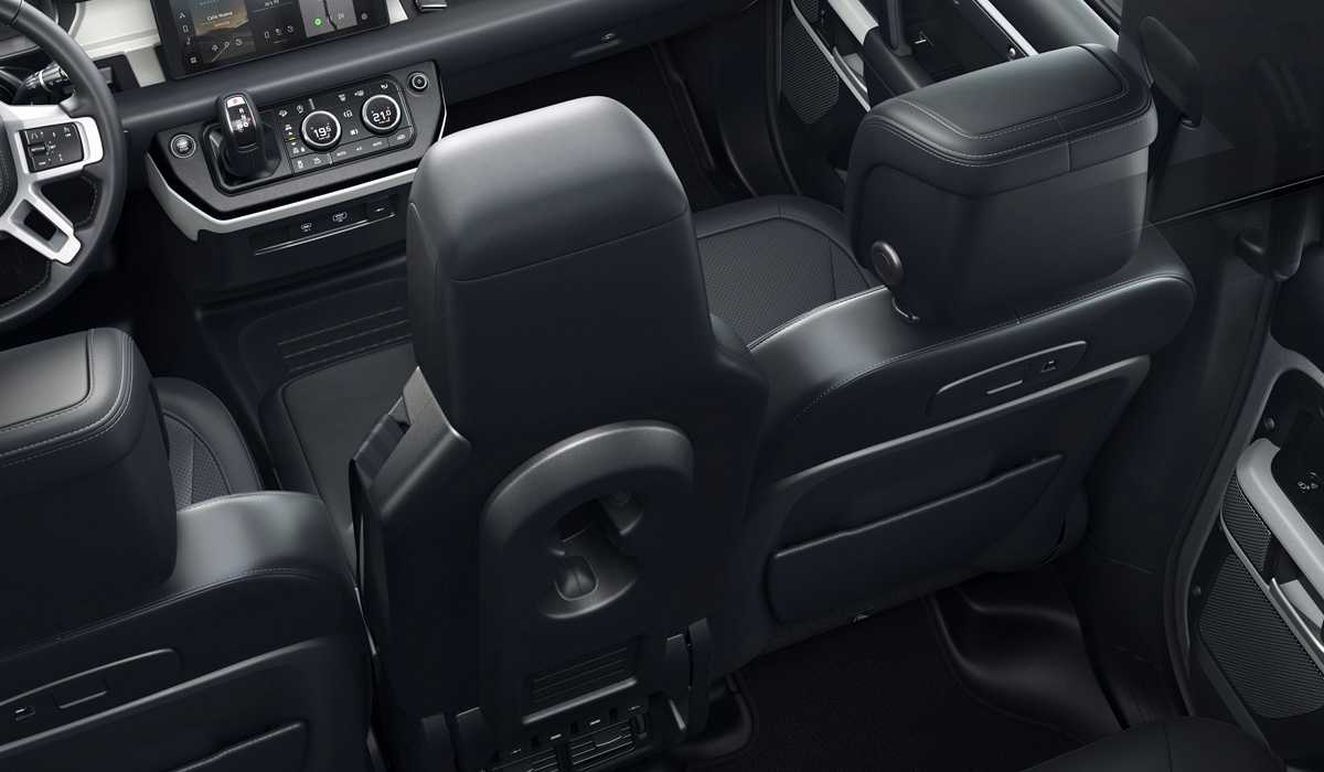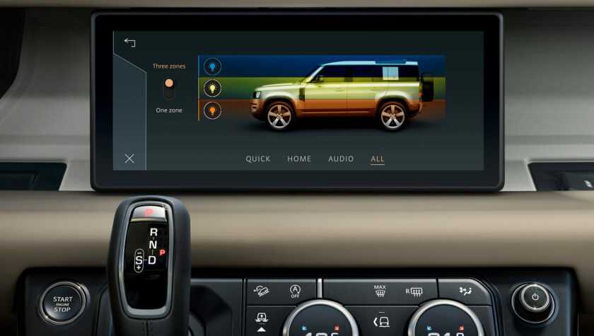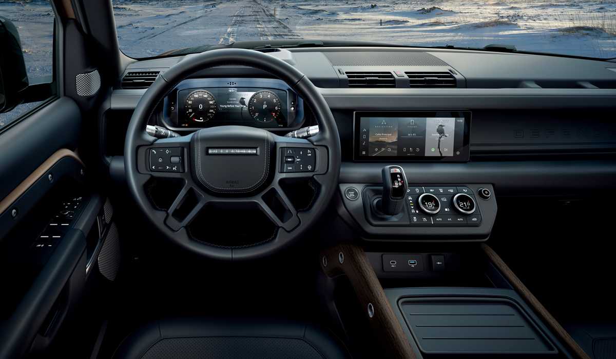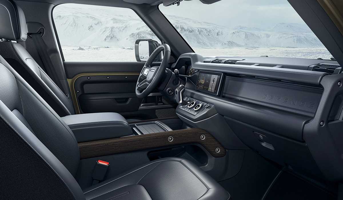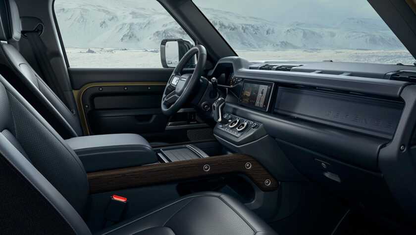 Покорение бездорожья не должно лишать водителя и пассажиров нового Land Rover Defender 2021 года максимального комфорта, поэтому здесь и виртуальные приборы на дисплее 12.3”, и двухзонный климат-контроль, и сдвижная панорамная крыша (может заменяться матерчатой), и мультируль, и качественная кожа для обивки кресел.