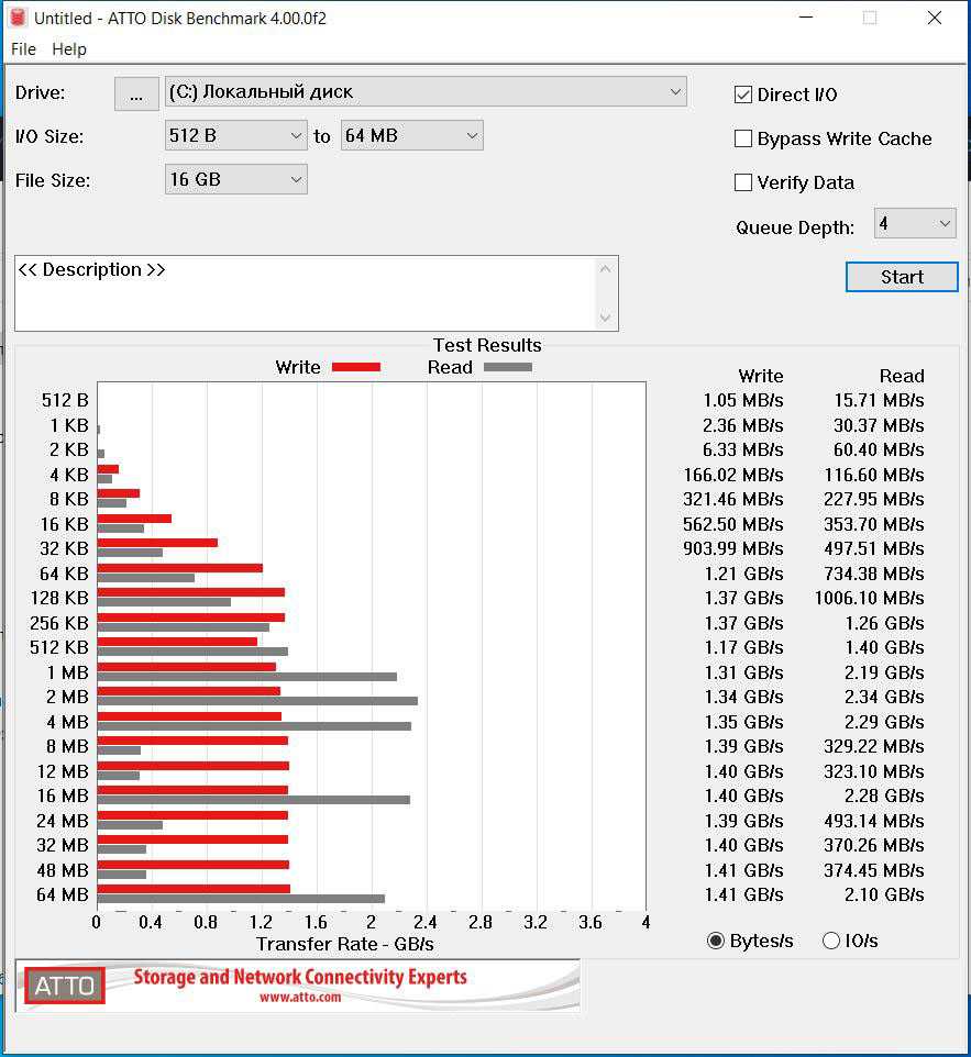 Судя по тестам, накопитель показывает средние скорости для класса M.2. Скорость записи не опускается ниже 1500 МБ/с при разных размерах тестовых файлов.