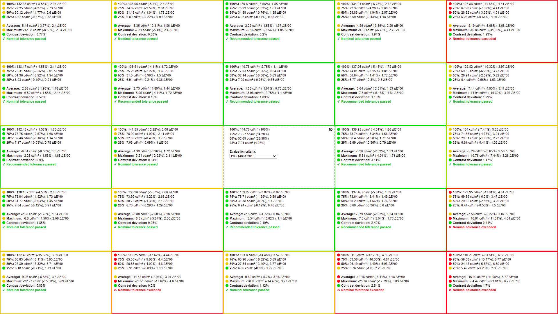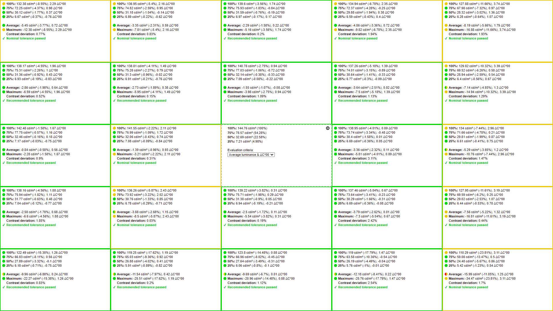 А вот однородность подсветки немного подкачала. При половинной яркости стандарт ISO 14861:2015 выявил отклонения выше нормальных (около 34 Кд/м2). Хотя, если оценивать значения по среднему значению ΔС*00, то ситуация в принципе простительная.