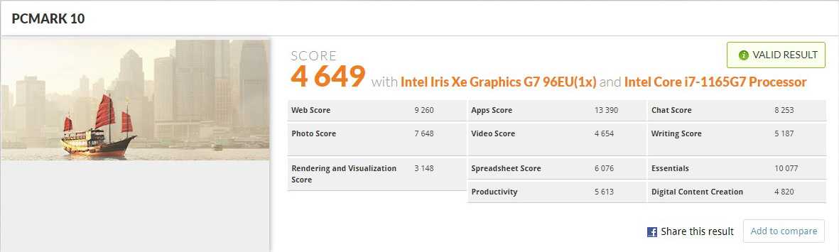 Комплексный бенчмарк производительности PCMark 10 показал хорошую общую производительность для классических задач – работа в редакторах, видеосвязь и пр.