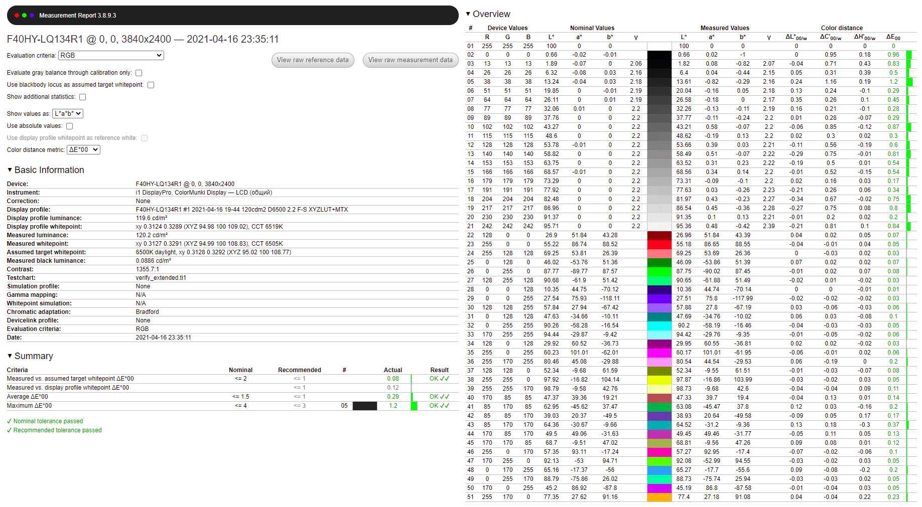 Дополнительный тест на правильность отображения оттенков пройден тоже на отлично – отклонения минимальные, в основном касаются серой гаммы, не больше 1,2 ΔE*00.