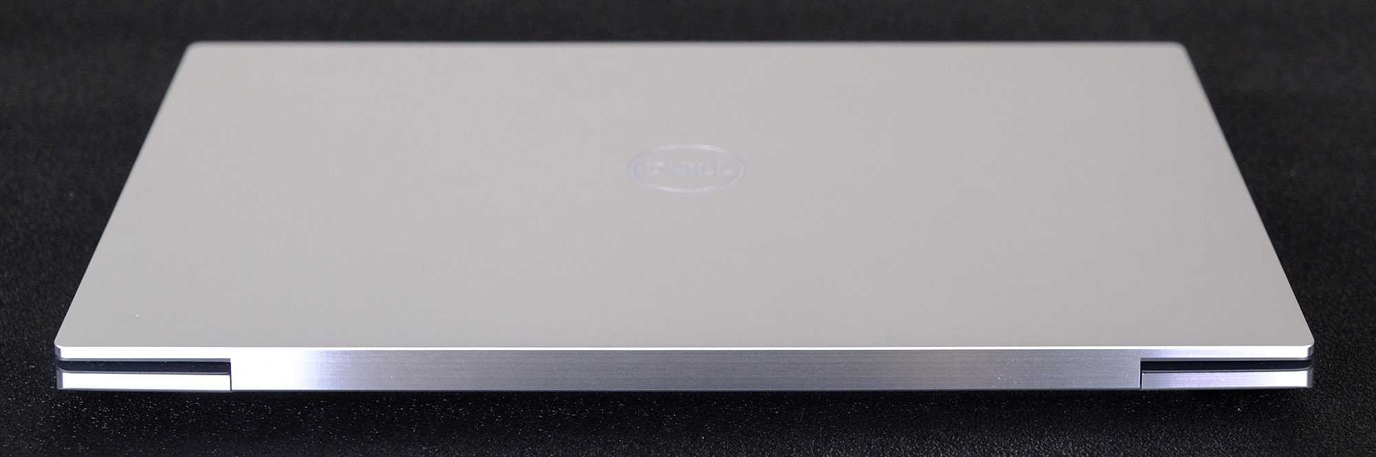Нам достался образец модели в чёрно-серебристой расцветке (крышка – серебристый металлик, топкейс и окантовка — чёрный). Смотрится он хорошо, из-за металлического корпуса в руках ультрабук ощущается как монолитный. На верхней панели есть только логотип Dell по центру.