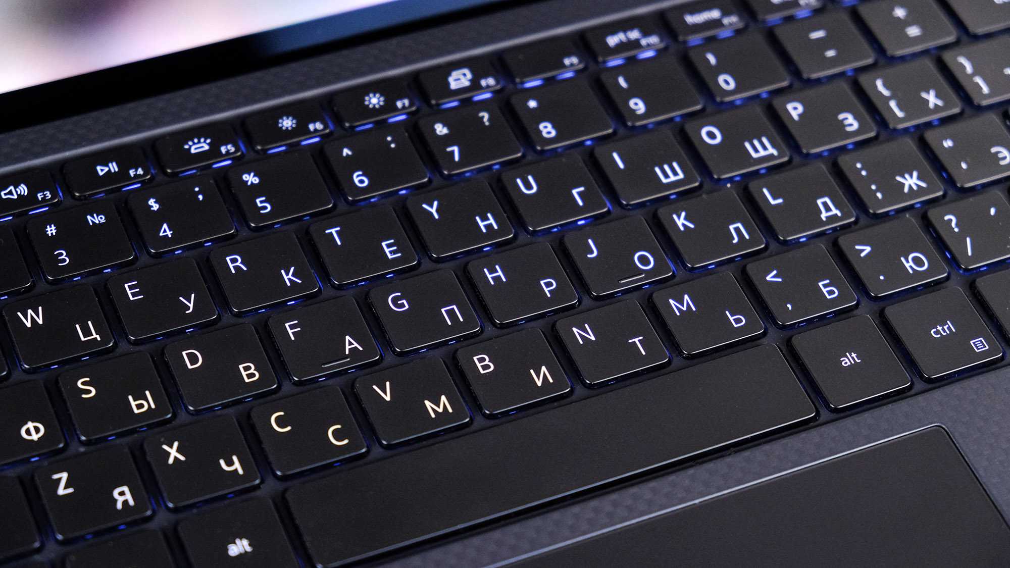 Качество клавиатуры Dell XPS 13 9370 одна из сильных сторон лэптопа. Это всё та же большая клавиатура, но с более жёстким и более осязательным нажатием клавиш. Подсветка клавиатуры стандартная с двумя уровнями регулировки яркости. На белом фоне качество освещения трудно оценить — кнопки подсвечиваются неравномерно, а свет немного тусклый.