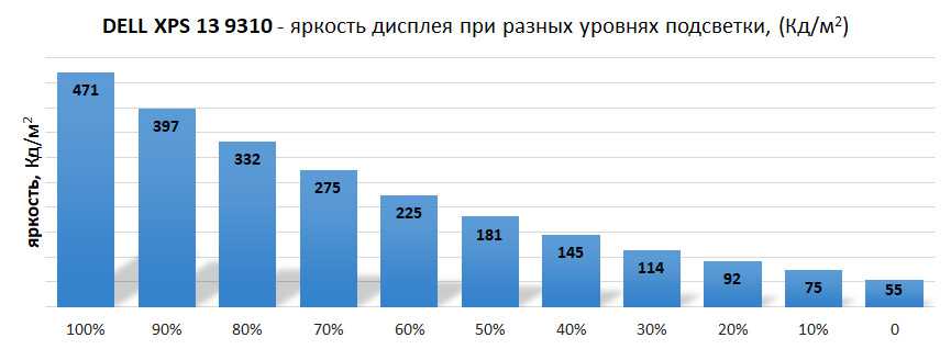 Яркость у дисплея превосходная. Максимальные значения около 470 кд/м2, что позволяет работать в солнечный день. Регулировка яркости линейная. В низком диапазоне не так много значений, а минимум – 55 Кд/м2, что может оказаться многовато при работе в темноте.