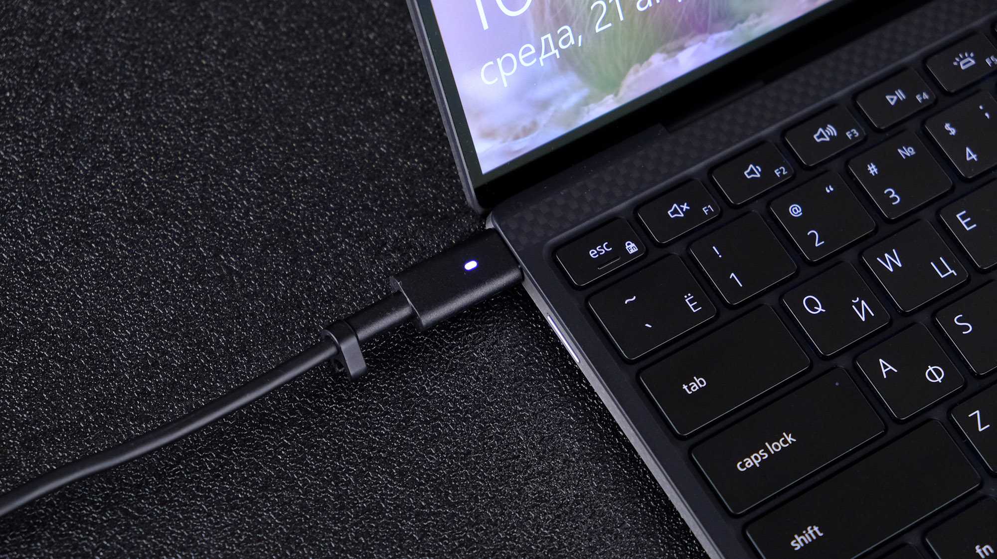 Зарядное устройство в комплекте, подходящее для формата ультрабука – очень миниатюрный блок на 45 Вт весом всего 135 грамм. При напряжении 15 В он обеспечивает ток 3 А и способен зарядить Dell XPS 13 9310 примерно за 2 часа полностью. Есть функция быстрой зарядки, так что первые 70% батарея набирает за первый час.