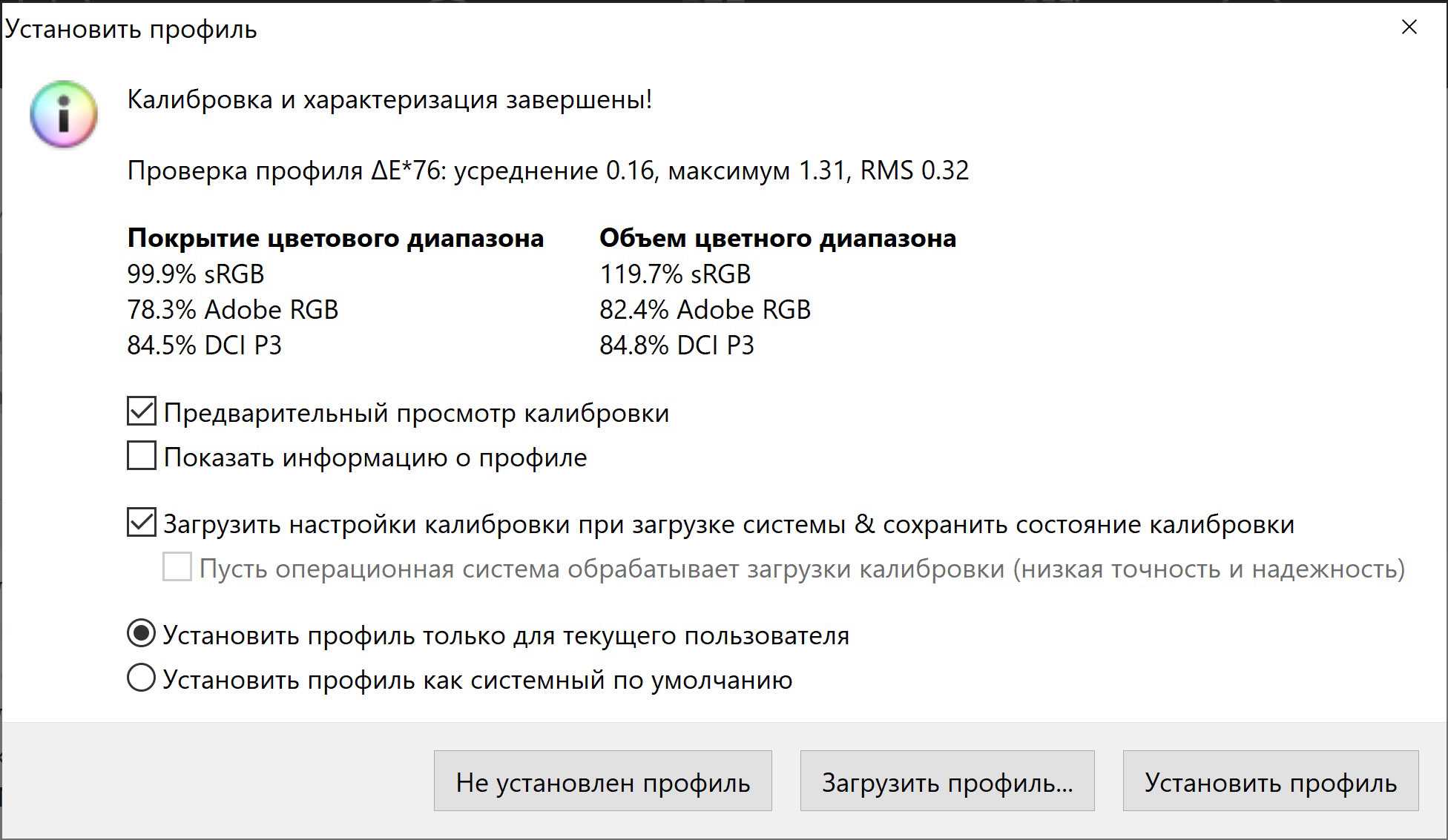 Проверка цветового охвата в DisplayCal показала значение в 99,9% sRGB, что можно округлить до 100%. Отличный уровень, означающий возможность профессионально работать на таком дисплее с цветом, а также хорошую IPS-матрицу.