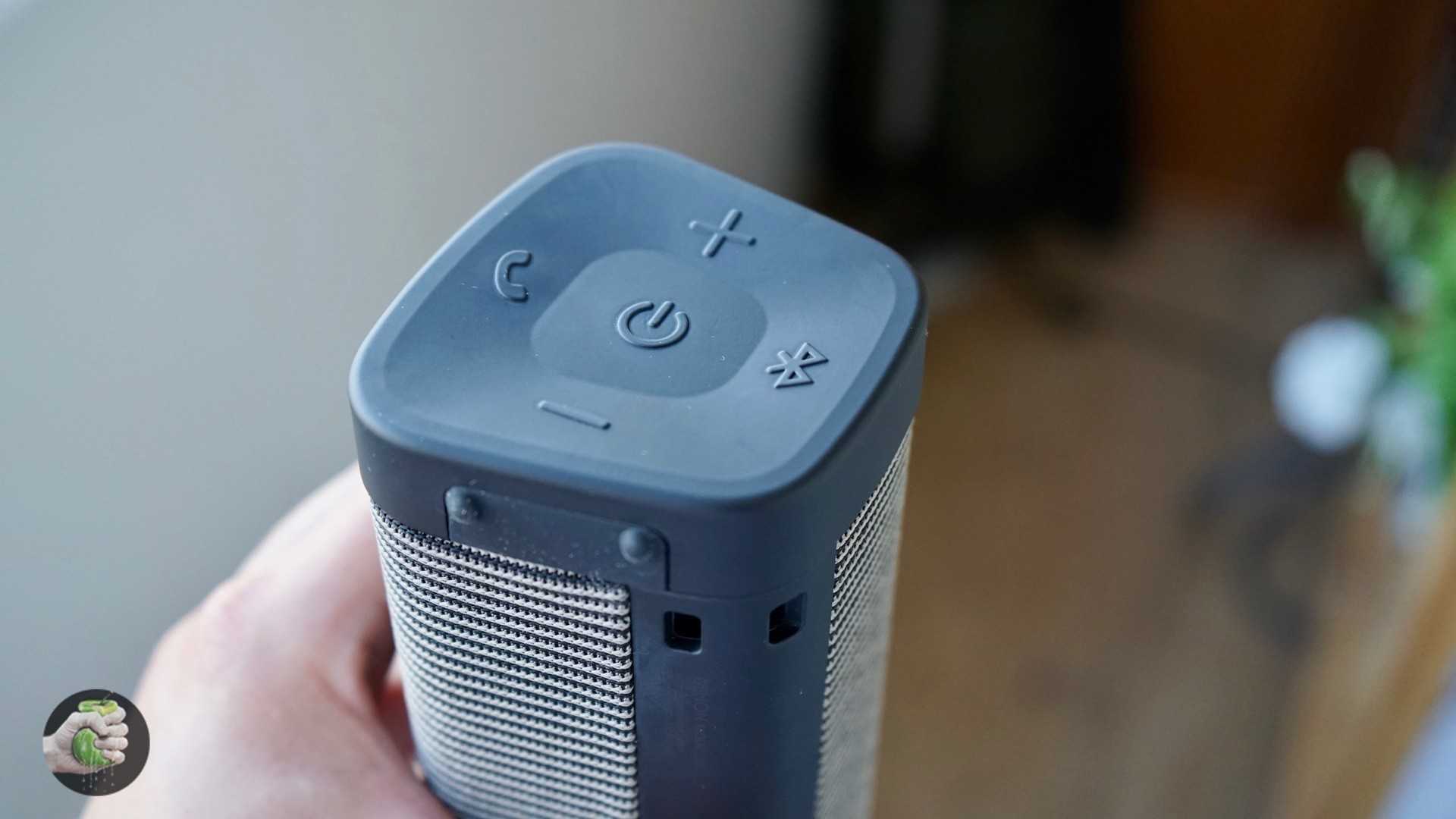 Собрана колонка плотно, крепко, резина по бокам твердая и не особо восприимчива к отпечаткам, тканевая оплетка плотно прижата к корпусу. Кнопки тут сенсорные, можете их не вжимать — достаточно прикоснуться. Для подключения по Bluetooth есть отдельная кнопка и это хорошо.