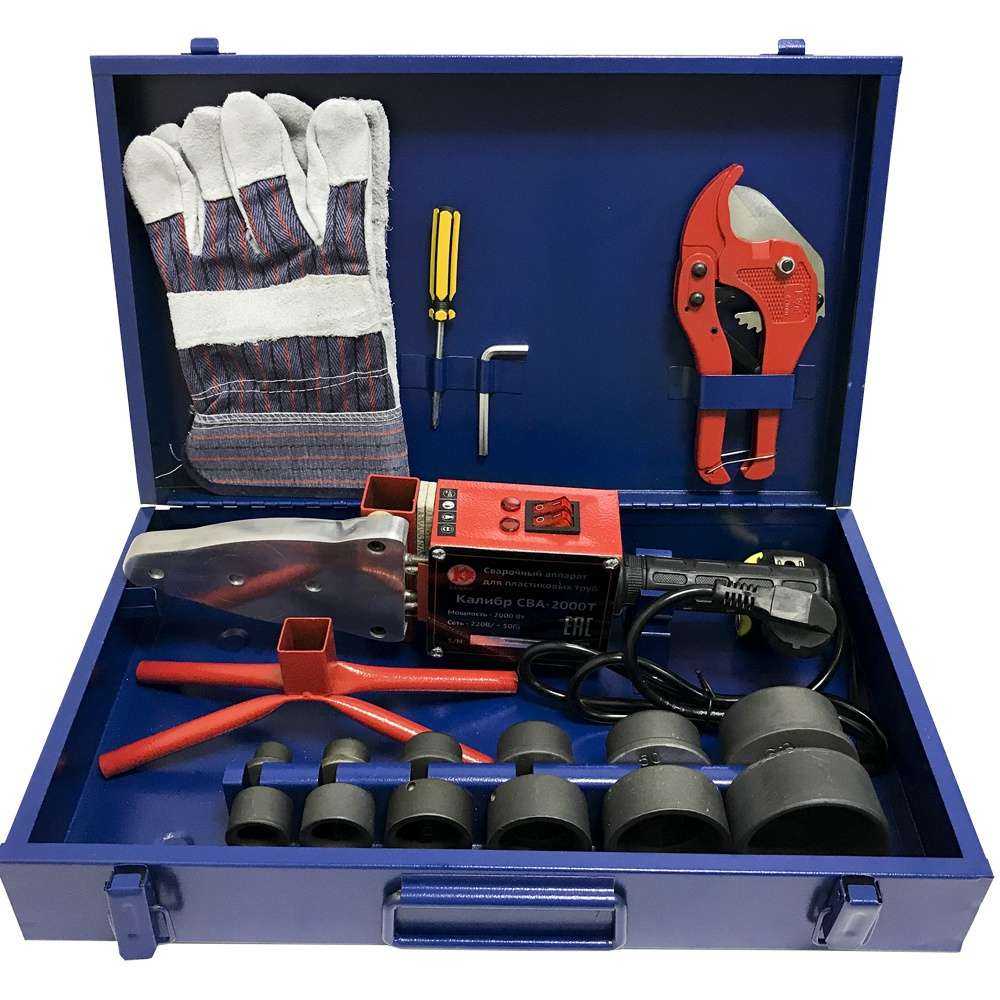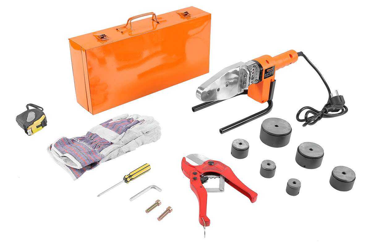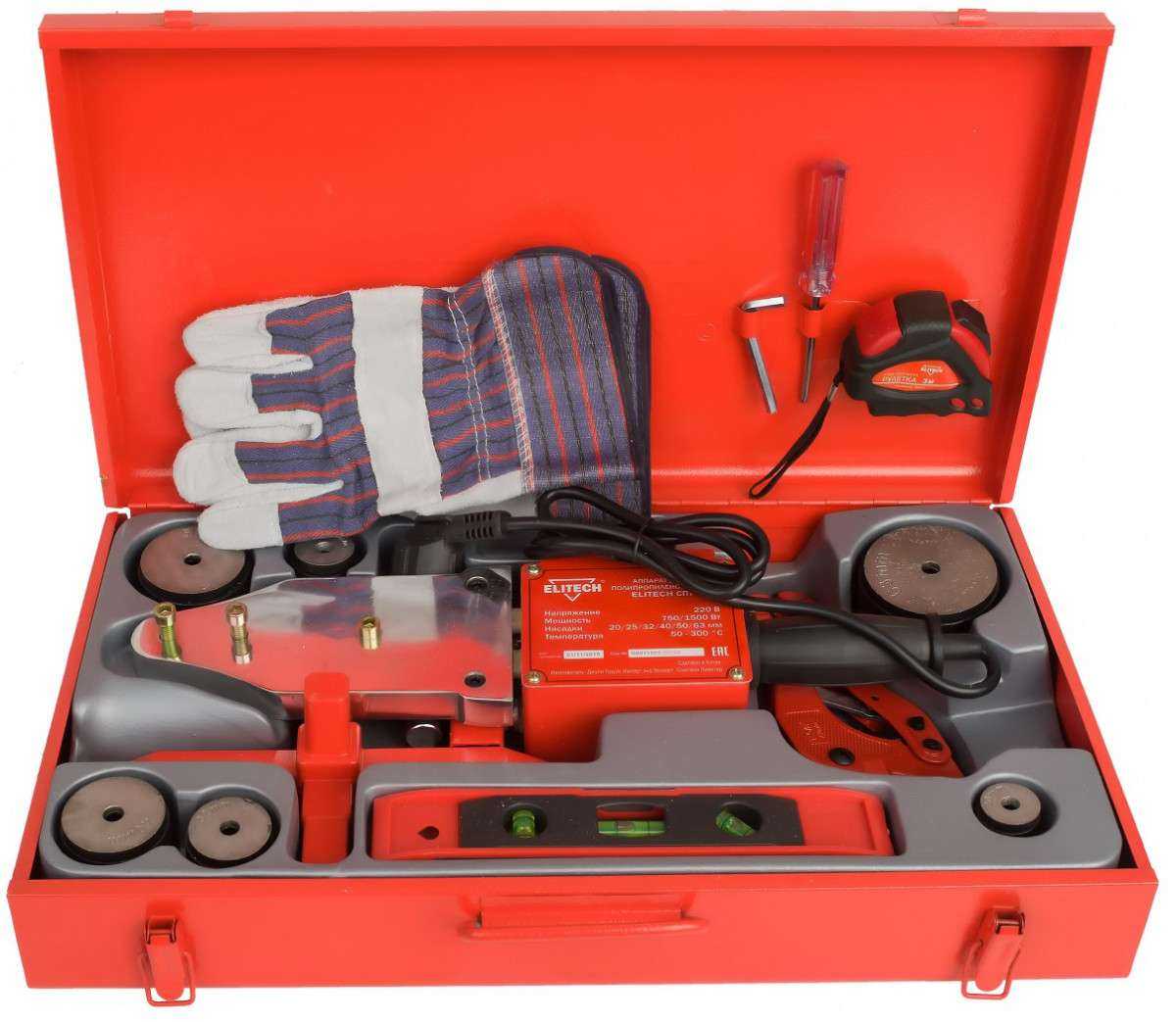 В комплекте, кроме самого паяльника, Вы получите набор насадок, подставку, труборез, рулетку, перчатки, отвертку, шестигранный ключ, металлический кейс и документацию. Упаковка – картон.