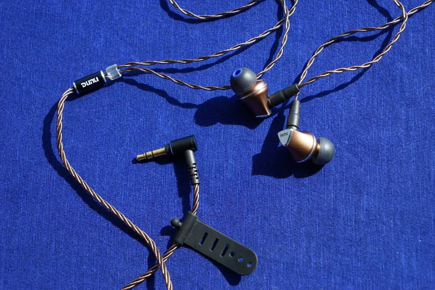 Кабель не просто сделали плетеным с MMCX-разъемами, он сочетает в себе медь и серебро, мягкий и почти исключает микрофонный эффект. Есть петелька для поддержки сложенного провода. Даже специальные насадки для бегунов положили! Только за это можно любить китайских производителей, подход к комплекту поставки у них царский — что у FiiO, что у Dunu. Обилие насадок в комплекте позволяет подобрать себе подходящий для комфортного ношения вариант.