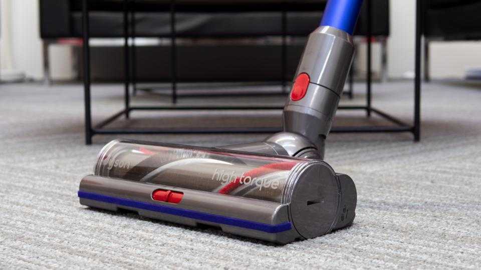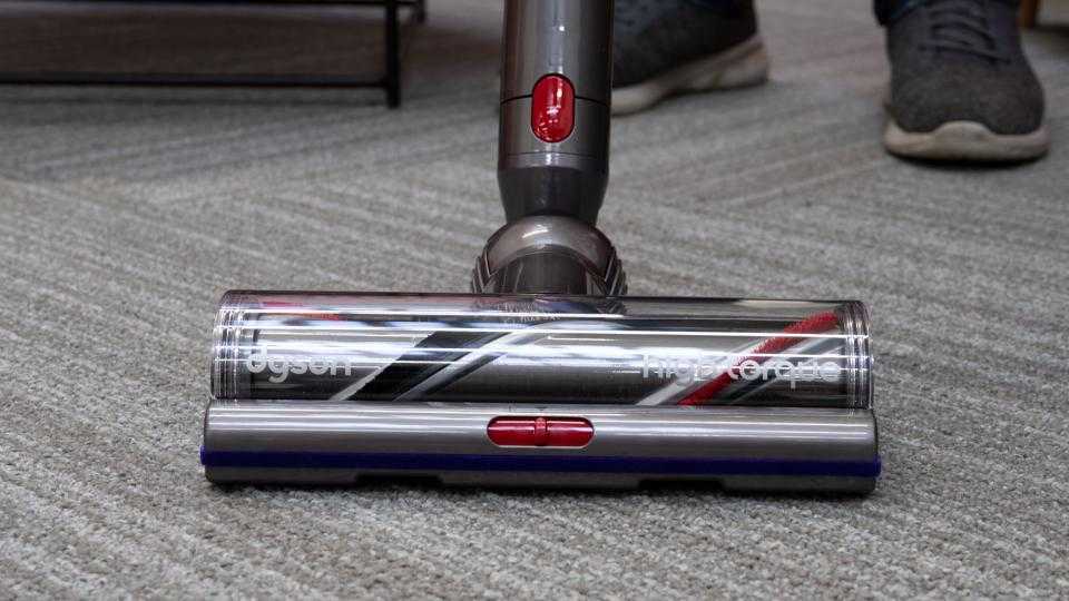 Даже с горсткой липких Cheerios, разбросанных по твердому полу, головка высокого крутящего момента V11 способна перевернуться и вычистить беспорядок. С V10 вам придется переключиться на головку с мягким роликом, прежде чем приступить к работе, потому что головка прямого привода просто выталкивает более крупные частицы, как это.
